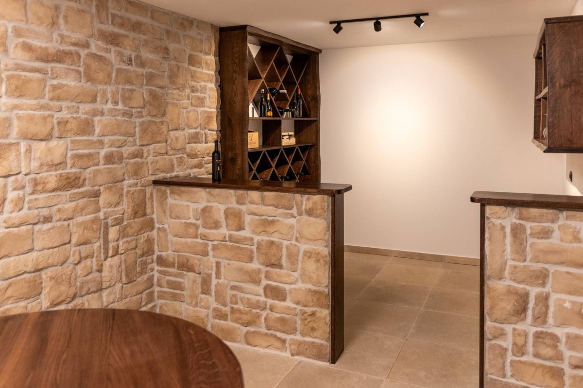 Keller - Flur, Weinkeller mit Verkostungsraum, Fitness, vorgesehene finnische und türkische Sauna, WC, Dusche und Lagerraum