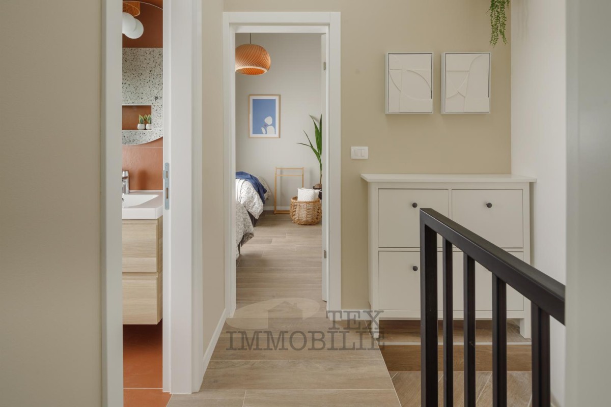 Die innere Treppe führt ins Obergeschoss, wo sich zwei Schlafzimmer, ein modern gestaltetes Badezimmer und ein Flur befinden, der alle Räume miteinander verbindet.