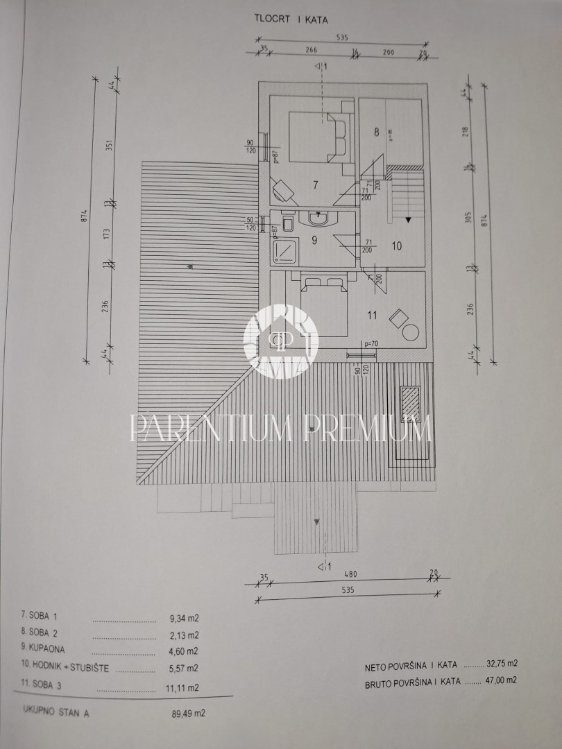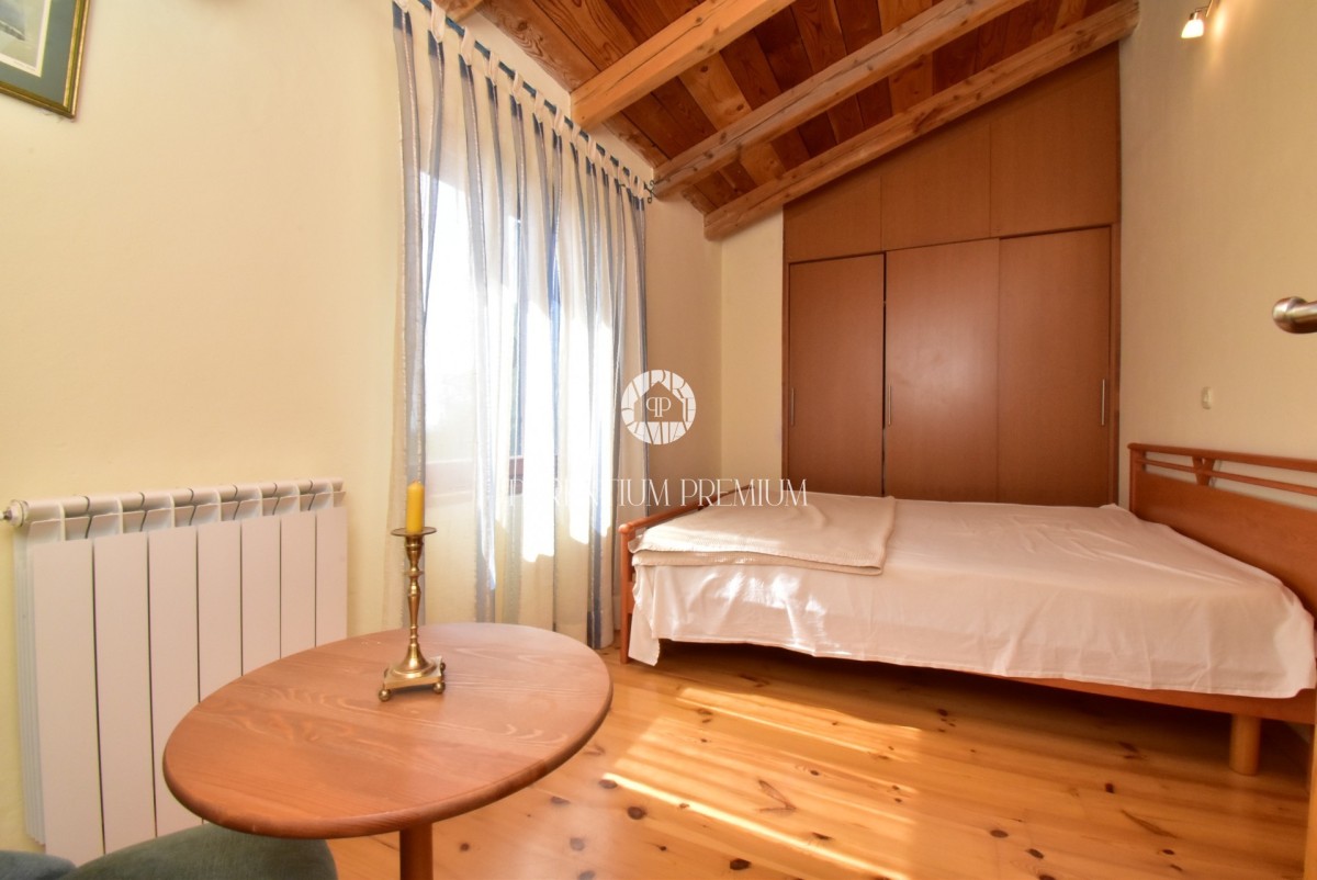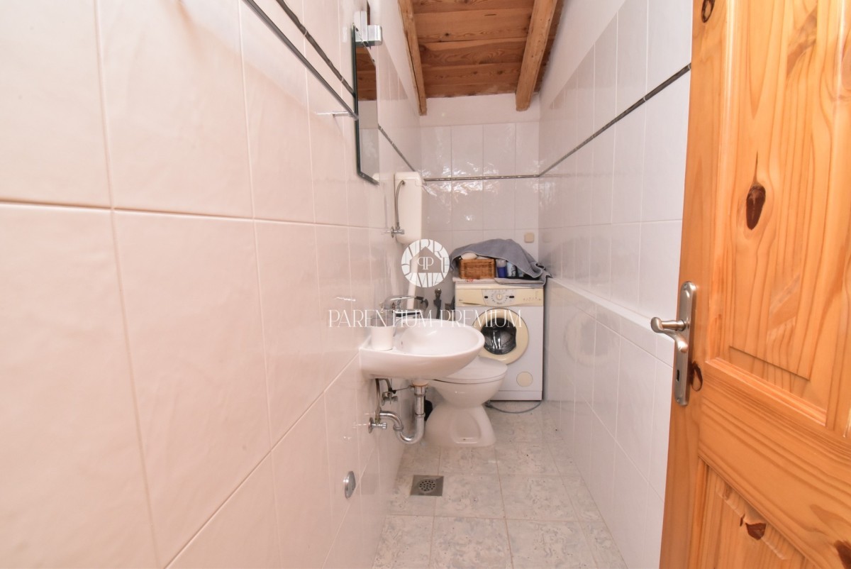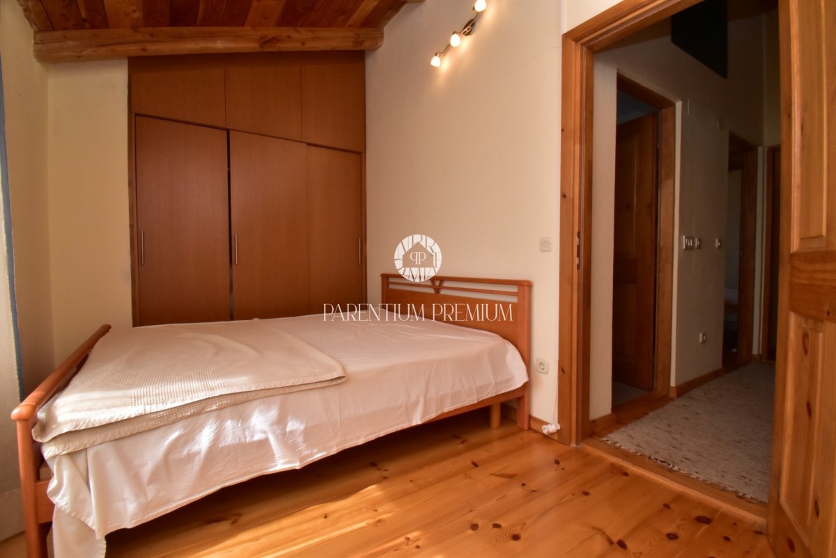 Im Obergeschoss befinden sich zwei Schlafzimmer, ein weiteres kleineres Zimmer mit Kinderbett sowie ein Badezimmer mit Dusche. Das Haus ist mit neuer PVC-Tischlerei und Insektenschutz ausgestattet.