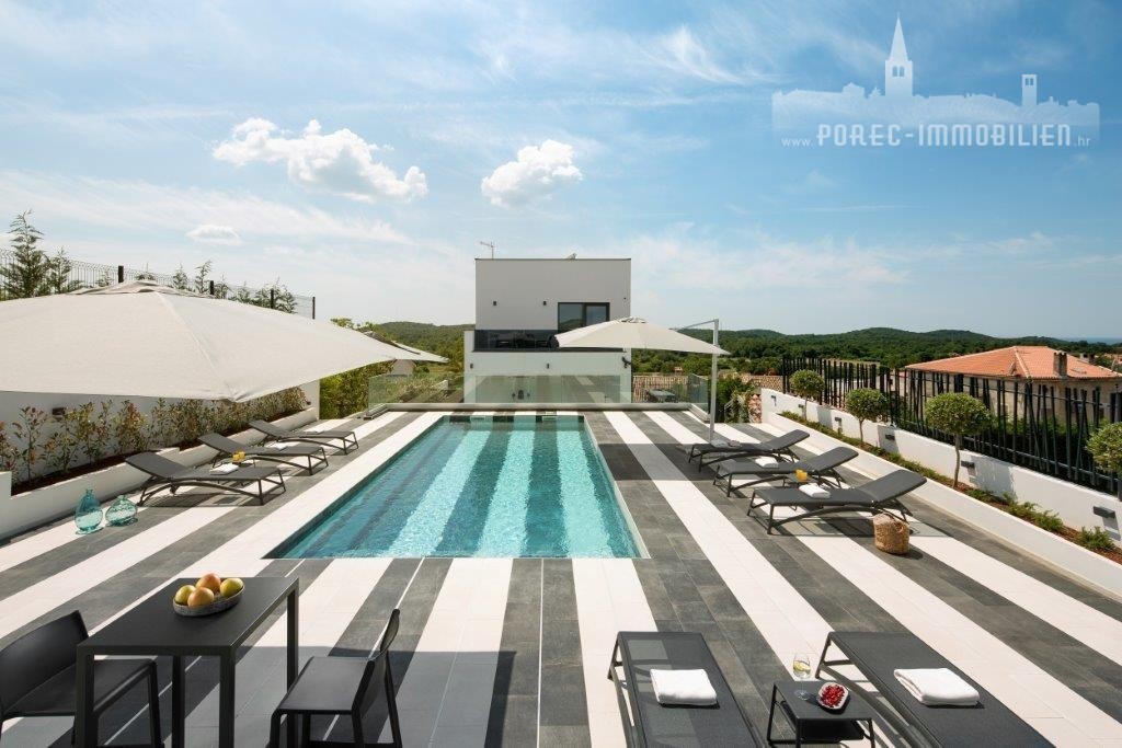 In einen kleinen istrischen Dorf unweit von Vrsar und der Lim-Bucht, auf einem Grundstück von 3790 m2 befindet sich diese einzigartige moderne Villa mit großem Pool und Tennisplatz, mit Meerblick.
