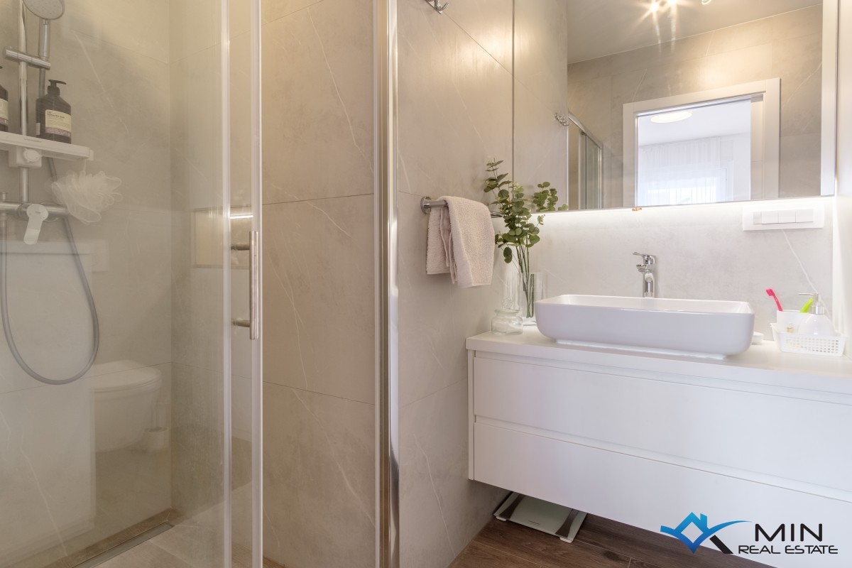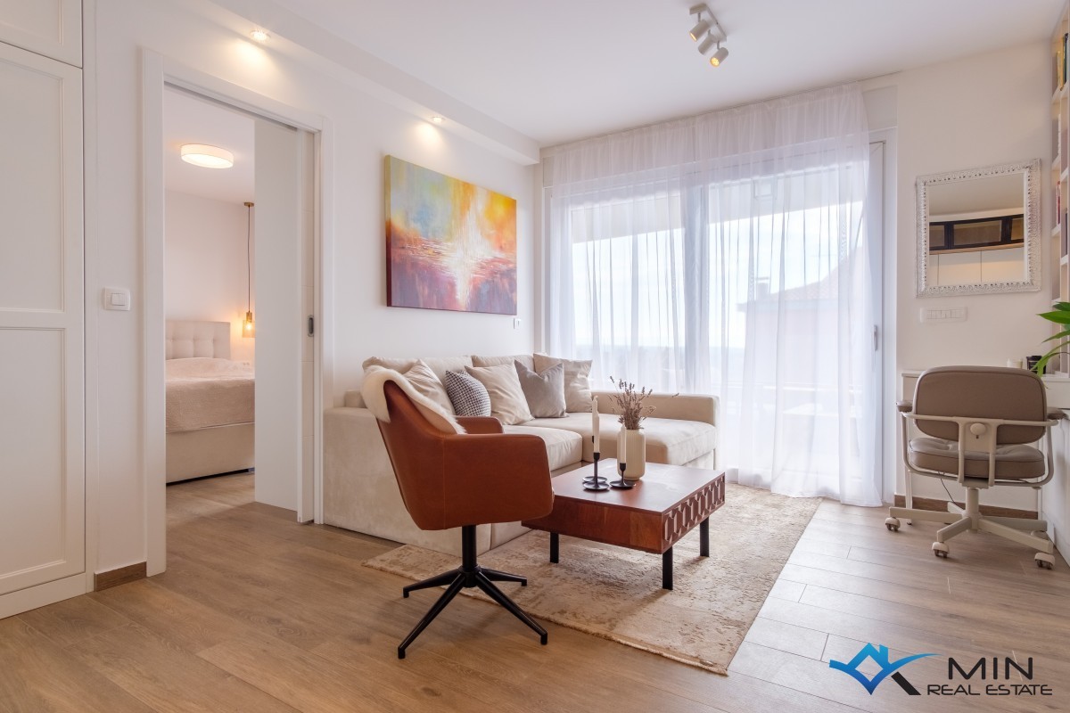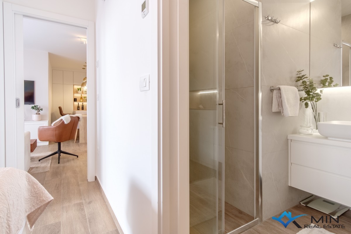 Zum Verkauf steht eine hochwertig ausgestattete Wohnung im 1. Stock eines Wohngebäudes mit insgesamt acht Einheiten. Die Wohnung besticht durch Wärme und modernes Design und wird inklusive maßgefertigter Möbel verkauft, die den Raum maximal funktional und elegant gestalten. Bei der Einrichtung wurde auf jedes Detail geachtet. Die Wohnung besteht aus einem Flur, einem Schlafzimmer mit eigenem Bad – das derzeit als modernes Home-Office genutzt wird –, einem zweiten Schlafzimmer mit eigenem Bad und Zugang zur Terrasse sowie einem offenen Wohnbereich mit Küche, Esszimmer und Wohnzimmer, der mit der großzügigen, überdachten Terrasse von 20 m² mit herrlichem Meerblick verbunden ist. Die Wohnung verfügt über eine elektrische Fußbodenheizung in allen Räumen (jede mit eigenem Thermostat), eine Klimaanlage in jedem Zimmer (insgesamt drei) und einen elektrischen Kamin, der die Atmosphäre und den Komfort zusätzlich erhöht. Außerdem ist ein Luft-Rekuperator eingebaut, der die Lebensqualität verbessert, indem er eine natürliche Luftzirkulation und einen effizienten Wärmeaustausch zwischen Innen- und Außenbereich bei minimalem Energieverbrauch ermöglicht. Ein großer Vorteil dieser Wohnung sind zwei Parkplätze, jeweils 12,5 m² groß.