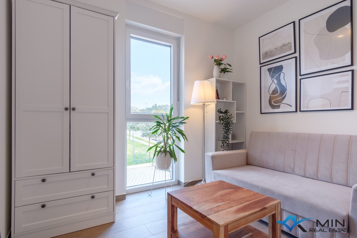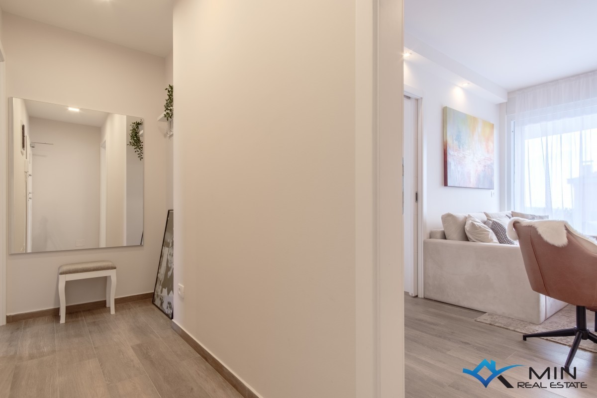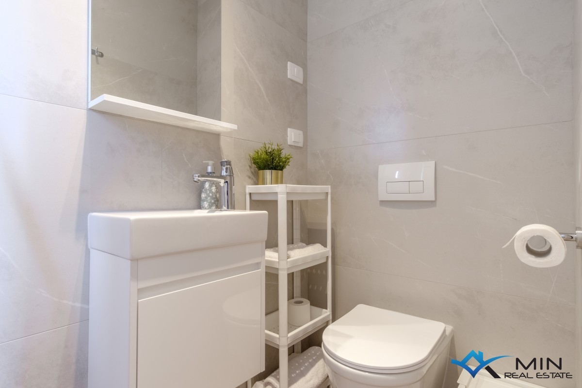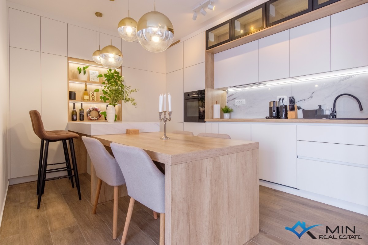 Zum Verkauf steht eine hochwertig ausgestattete Wohnung im 1. Stock eines Wohngebäudes mit insgesamt acht Einheiten. Die Wohnung besticht durch Wärme und modernes Design und wird inklusive maßgefertigter Möbel verkauft, die den Raum maximal funktional und elegant gestalten. Bei der Einrichtung wurde auf jedes Detail geachtet. Die Wohnung besteht aus einem Flur, einem Schlafzimmer mit eigenem Bad – das derzeit als modernes Home-Office genutzt wird –, einem zweiten Schlafzimmer mit eigenem Bad und Zugang zur Terrasse sowie einem offenen Wohnbereich mit Küche, Esszimmer und Wohnzimmer, der mit der großzügigen, überdachten Terrasse von 20 m² mit herrlichem Meerblick verbunden ist. Die Wohnung verfügt über eine elektrische Fußbodenheizung in allen Räumen (jede mit eigenem Thermostat), eine Klimaanlage in jedem Zimmer (insgesamt drei) und einen elektrischen Kamin, der die Atmosphäre und den Komfort zusätzlich erhöht. Außerdem ist ein Luft-Rekuperator eingebaut, der die Lebensqualität verbessert, indem er eine natürliche Luftzirkulation und einen effizienten Wärmeaustausch zwischen Innen- und Außenbereich bei minimalem Energieverbrauch ermöglicht. Ein großer Vorteil dieser Wohnung sind zwei Parkplätze, jeweils 12,5 m² groß.