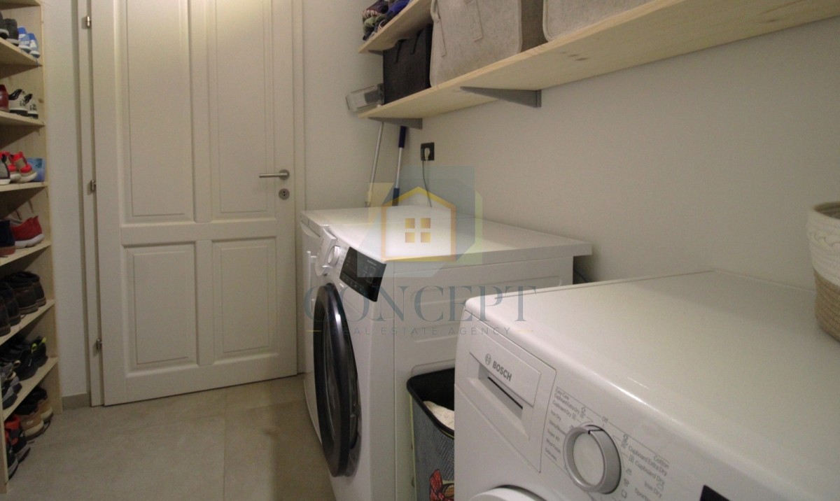 Maximale Funktionalität bietet der direkte Zugang zum Haus über den Hauswirtschaftsraum mit Waschmaschine, Trockner und Gefrierschrank, der direkt mit der großen Garage und dem Ausgang nach draußen verbunden ist. In der Garage befindet sich auch ein Werkraum.