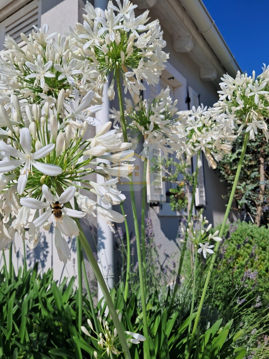 Der Garten ist liebevoll gestaltet und pflegeleicht, mit einem automatischen Bewässerungssystem und einem Rasenmäherroboter.