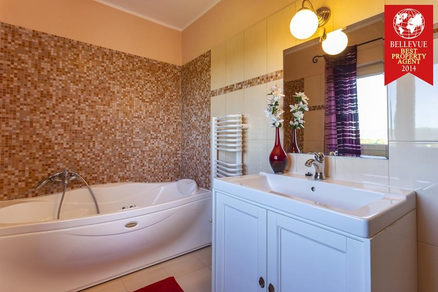 Im Erdgeschoss der Villa befindet sich eine voll ausgestattete Küche mit Essbereich, ein geräumiges Wohnzimmer mit Kamin und zusätzlicher Wohnraum, dessen Türen zum Innenhof der Villa mit Pool führen. modernes Badezimmer und eine schöne Loggia, die anstelle von zwei Wänden Glaswände hat und wie eine kleine grüne Galerie wirkt und sich ideal zum Entspannen bei Kaffee am Morgen oder Nachmittagstee eignet.