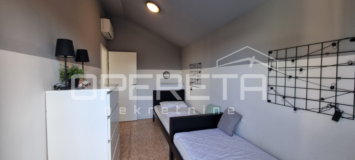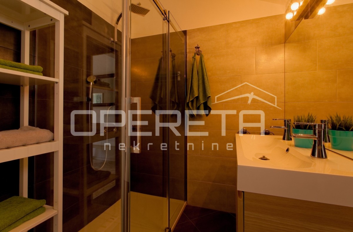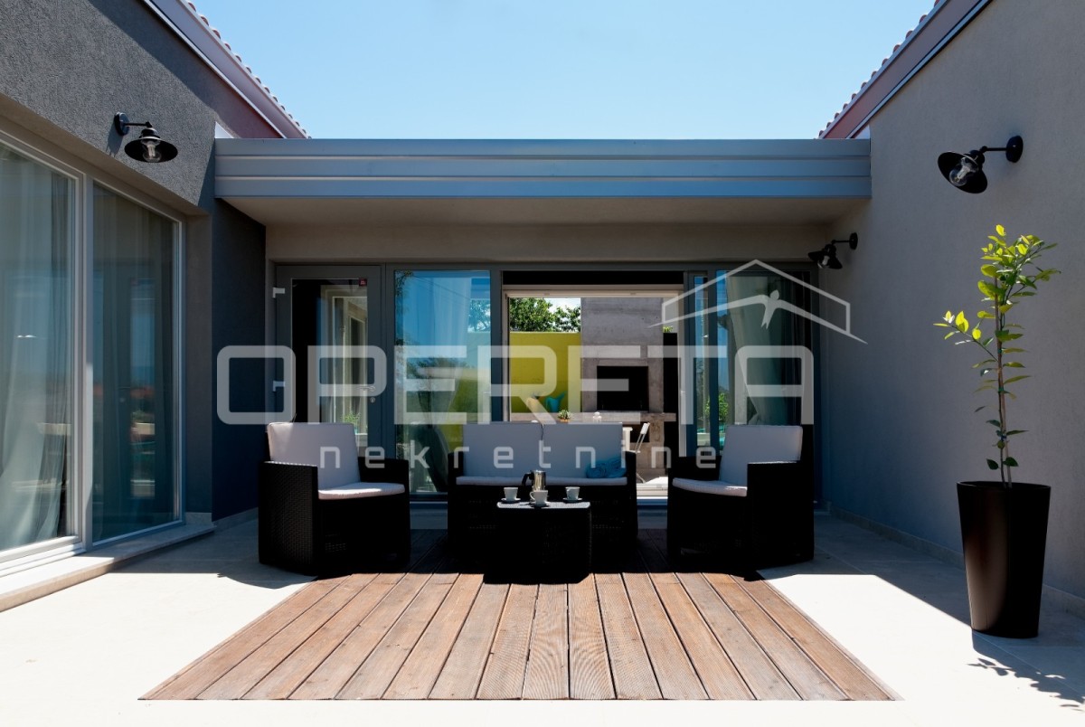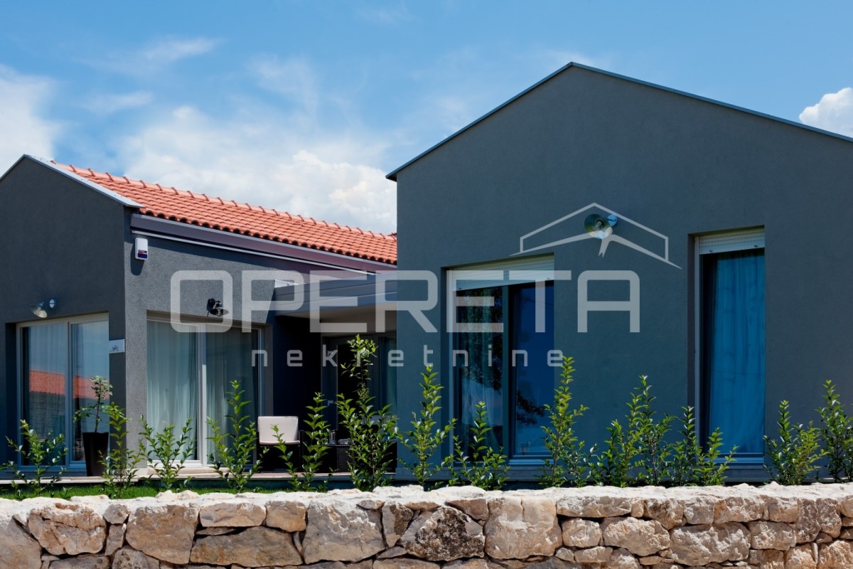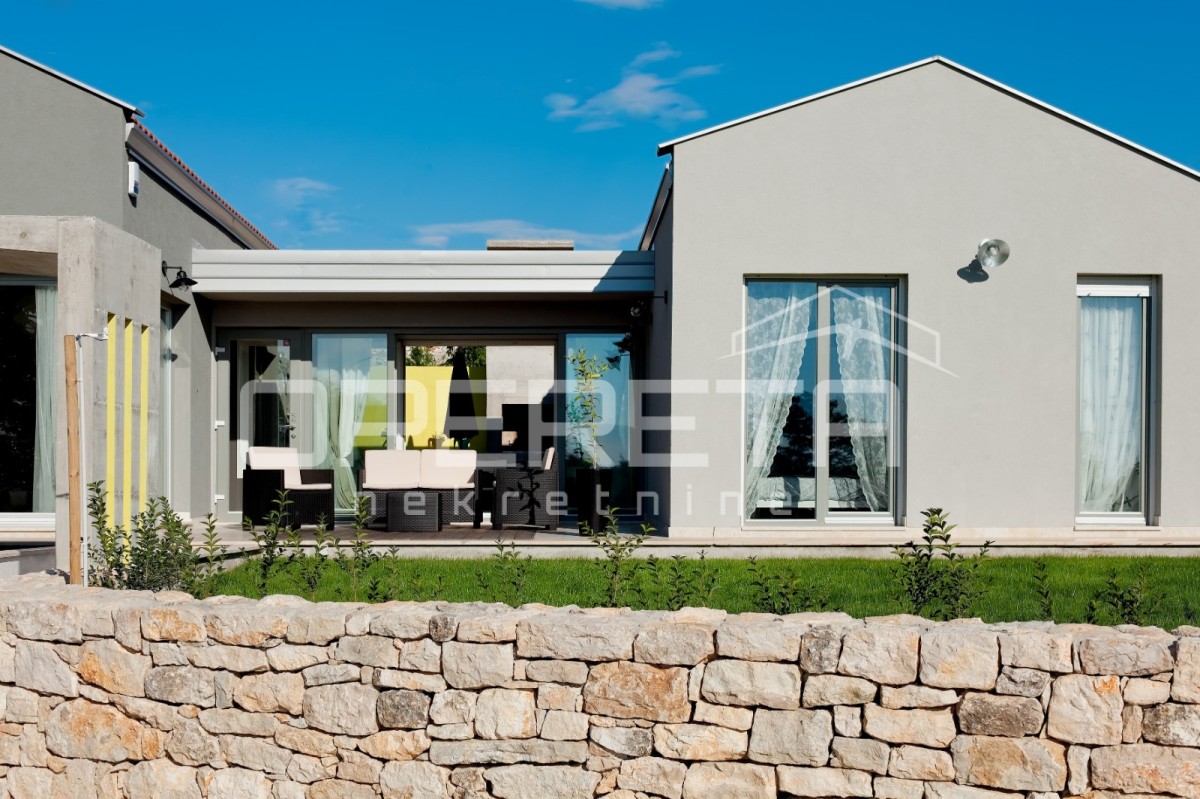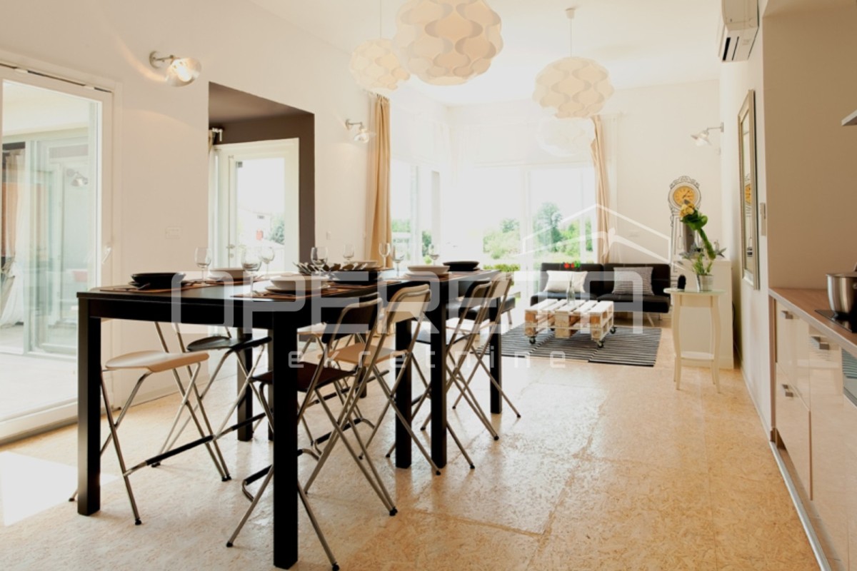 In einem ruhigen Dorf in der Nähe von Poreč, auf einem 324 m² großen Grundstück, befindet sich ein modernes Fertighaus mit einer Nettofläche von 117 m². Die architektonische Lösung wurde so konzipiert, dass ein Flur den Wohn- und Schlafbereich trennt und so ein ideales Gleichgewicht zwischen gemeinsamem Wohnen und Privatsphäre schafft.