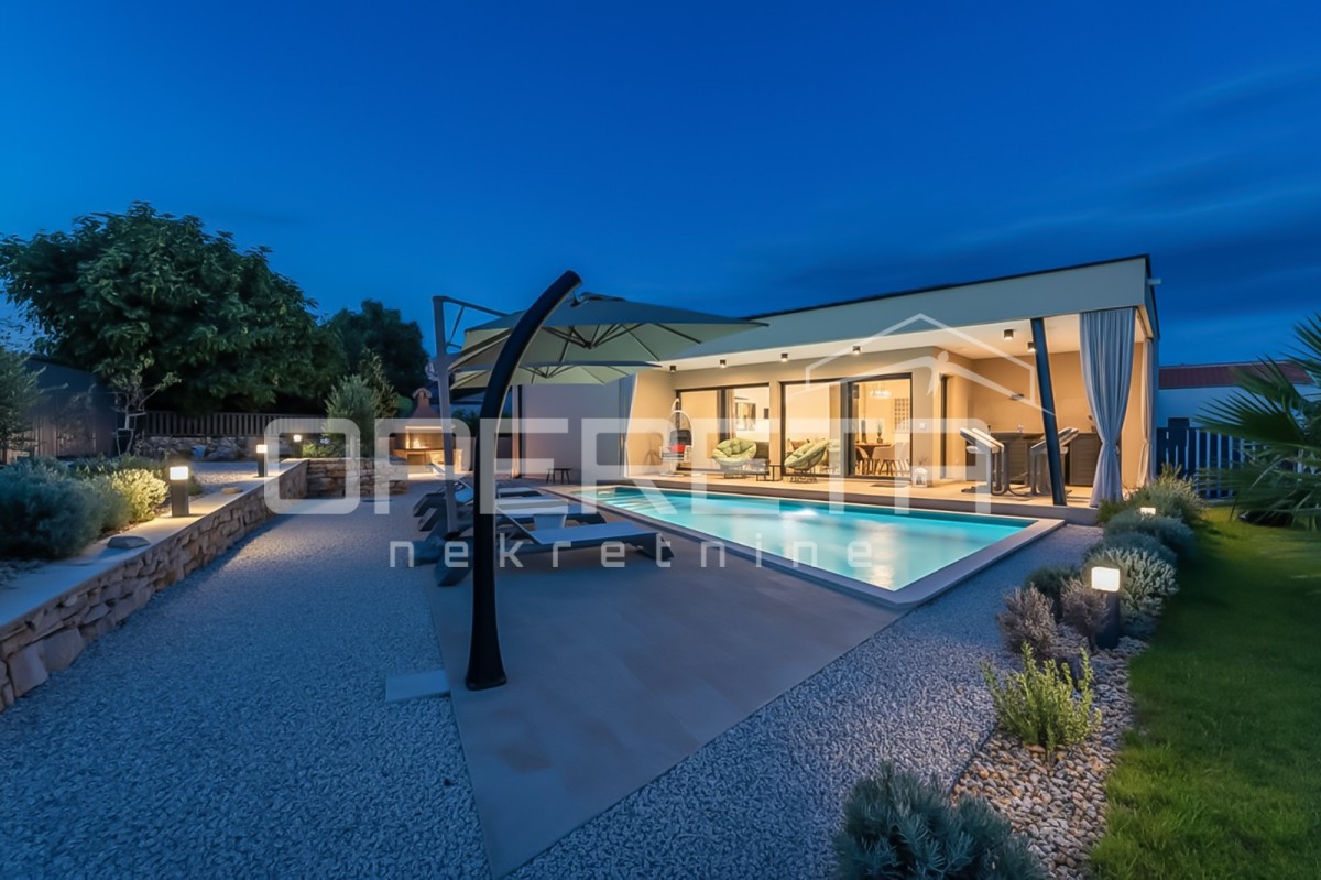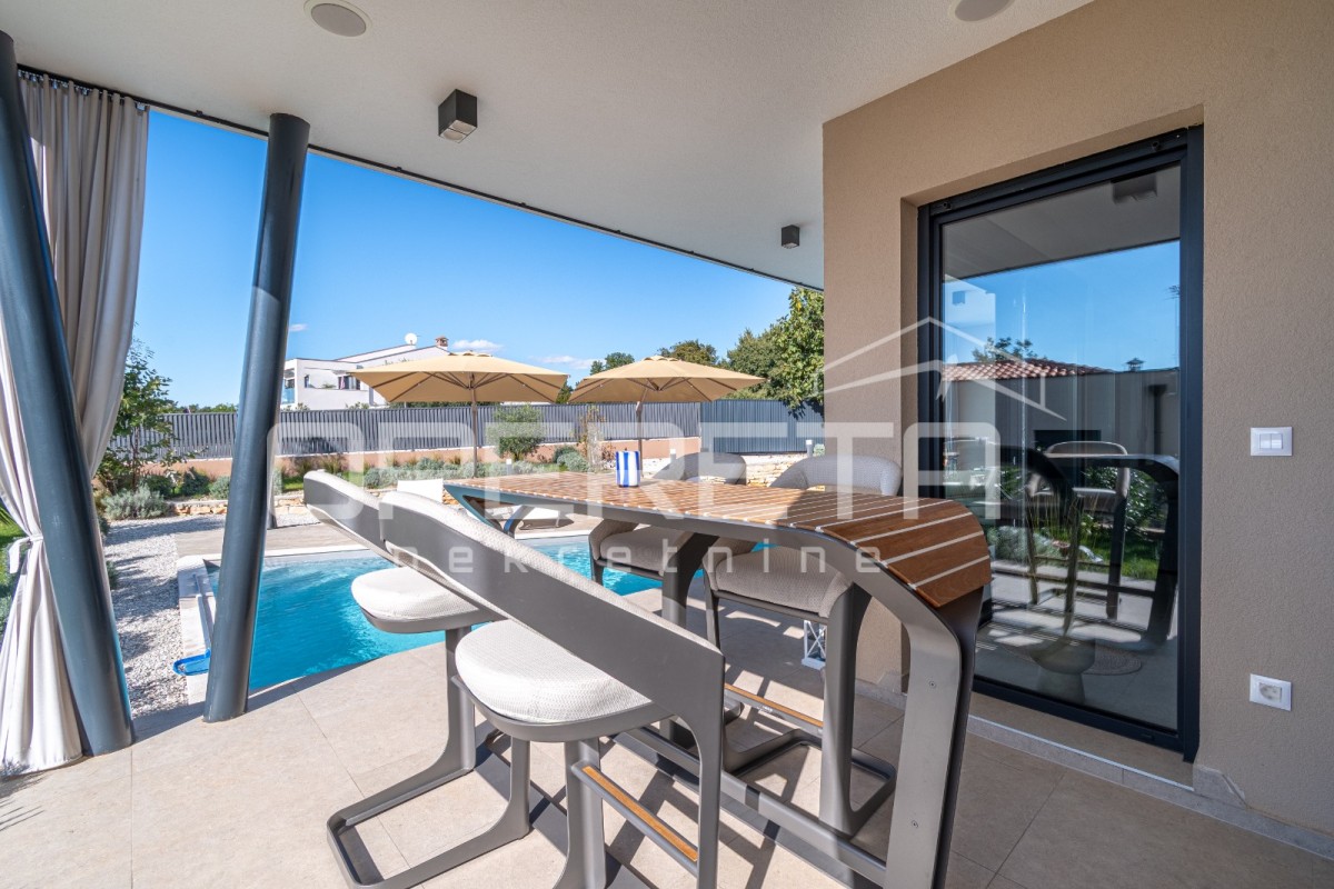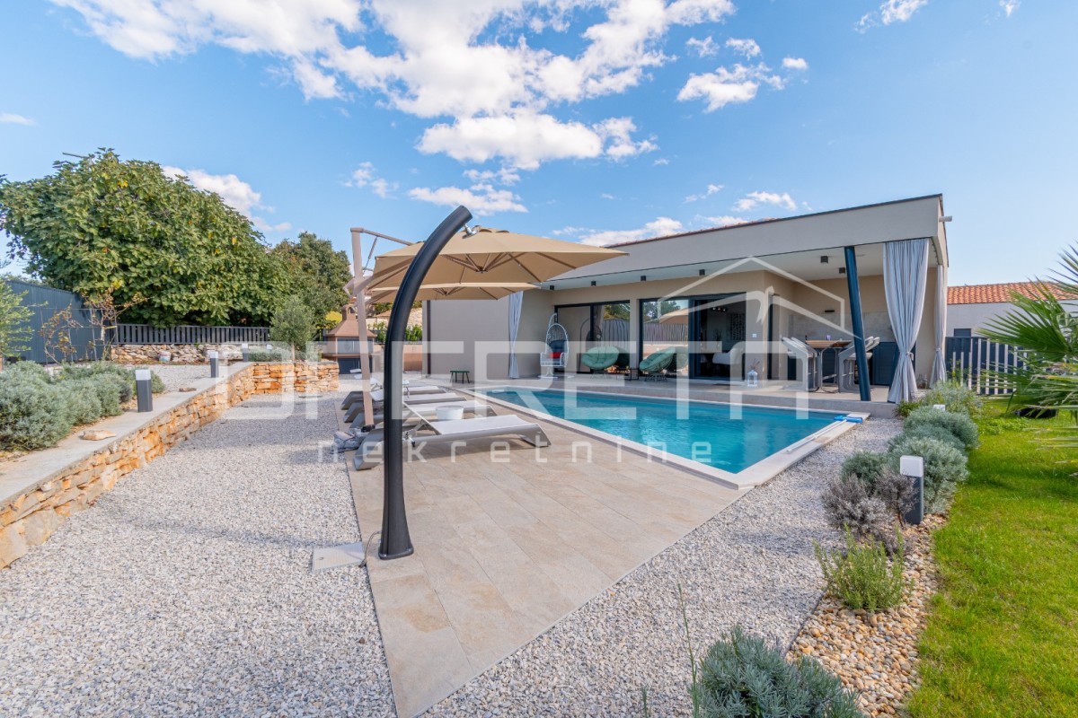 Das Haus besteht aus einem Eingangsbereich, einem Gäste-WC mit Waschküche und drei geräumigen Schlafzimmern. Zwei der Schlafzimmer teilen sich ein Badezimmer, während das Hauptschlafzimmer über ein eigenes Bad verfügt. Das offene Konzept von Küche, Ess- und Wohnzimmer sorgt für ein luftiges und verbundenes Raumgefühl. Von hier aus gelangt man auf eine überdachte Terrasse mit Sommerküche, einer Liegewiese und einem Pool.
