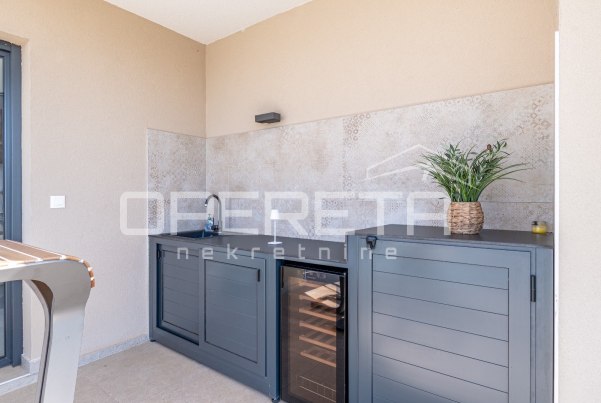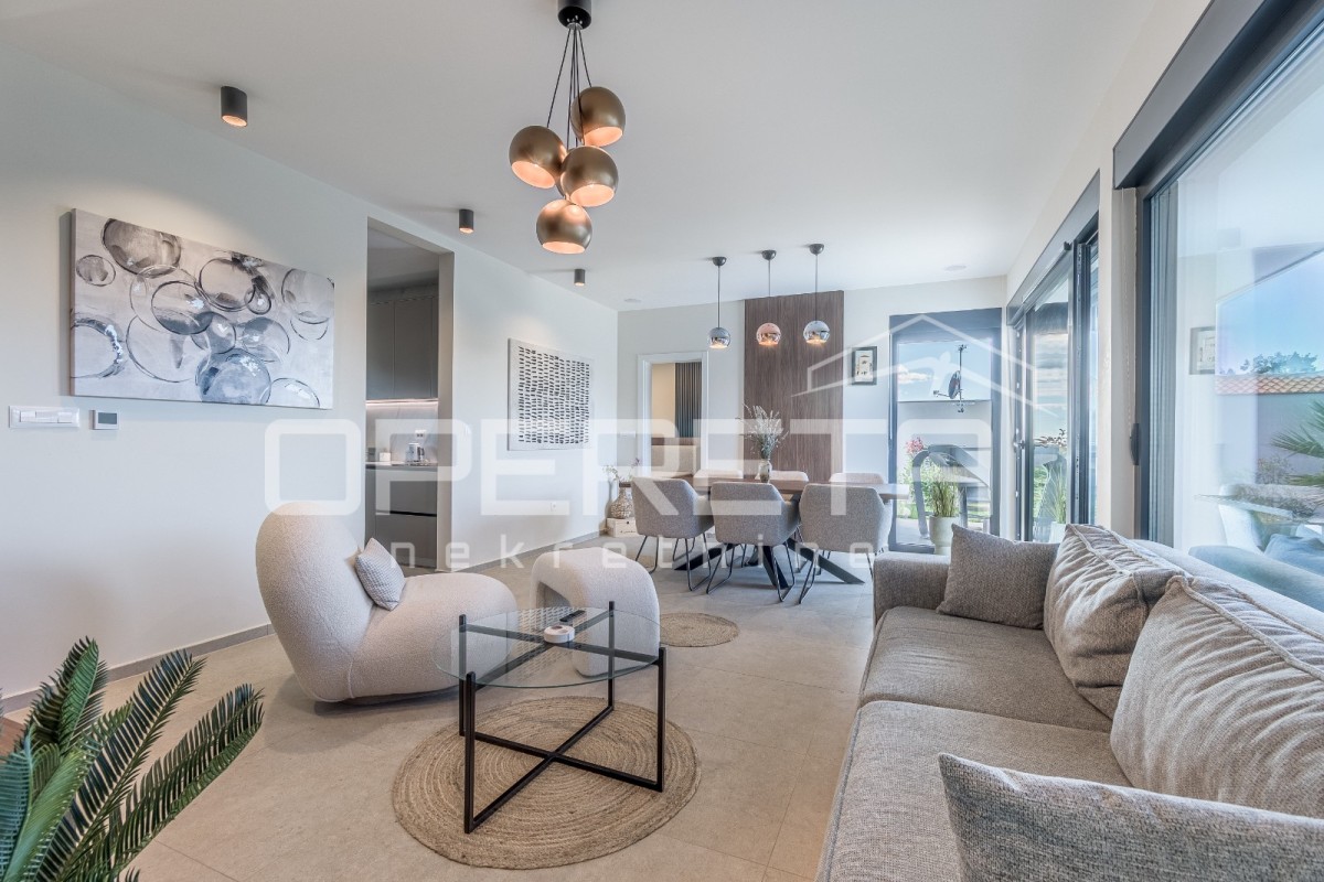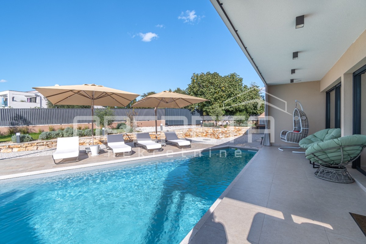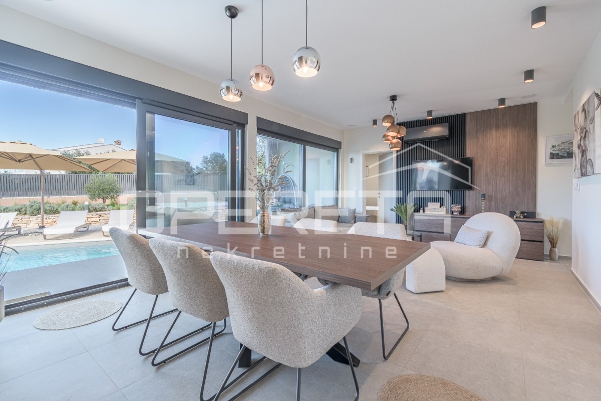 Das Haus besteht aus einem Eingangsbereich, einem Gäste-WC mit Waschküche und drei geräumigen Schlafzimmern. Zwei der Schlafzimmer teilen sich ein Badezimmer, während das Hauptschlafzimmer über ein eigenes Bad verfügt. Das offene Konzept von Küche, Ess- und Wohnzimmer sorgt für ein luftiges und verbundenes Raumgefühl. Von hier aus gelangt man auf eine überdachte Terrasse mit Sommerküche, einer Liegewiese und einem Pool.