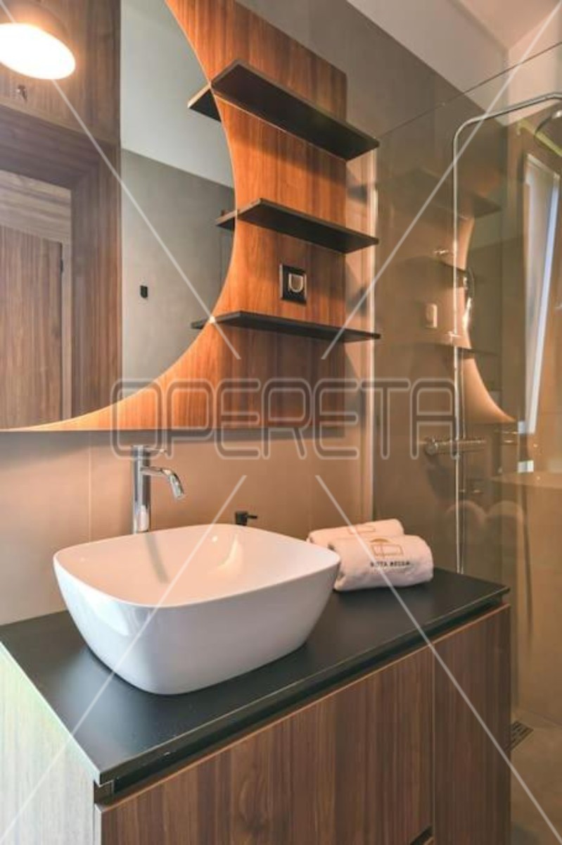 Das 102 m² große Haus besteht aus zwei Schlafzimmern, zwei Badezimmern, einem Wohnzimmer mit Küche und einem Esszimmer in einer Einheit, die Zugang zu einer überdachten Terrasse und einem Garten mit Liegewiese und einem 40 m² großen Pool haben.