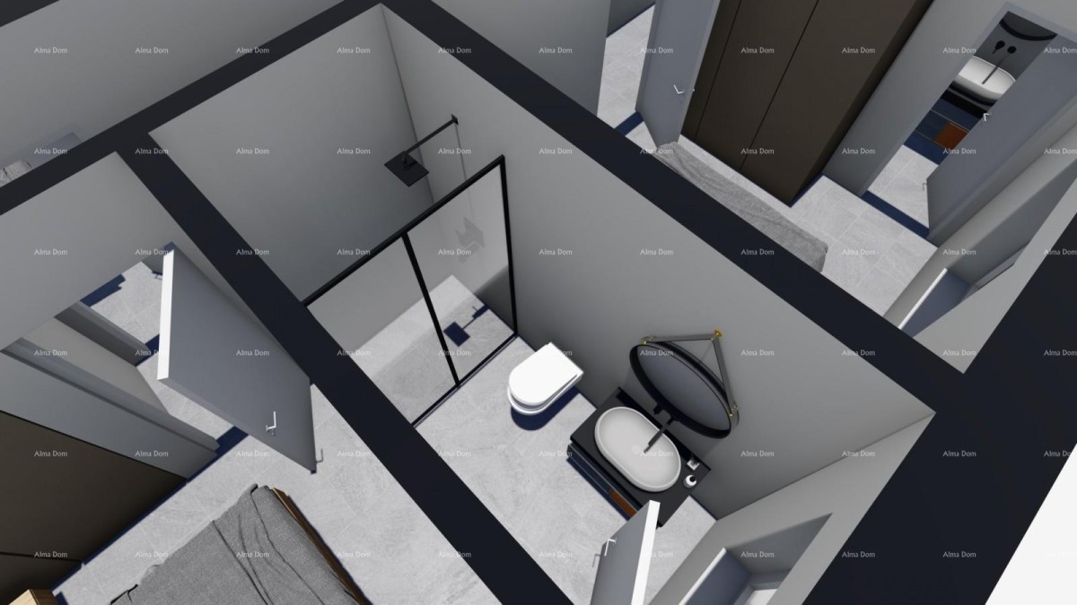 Eine Nebeneinrichtung (Taverne) von 20 m2 wird aus einem Badezimmer, einer Küche und einem Esszimmer bestehen.