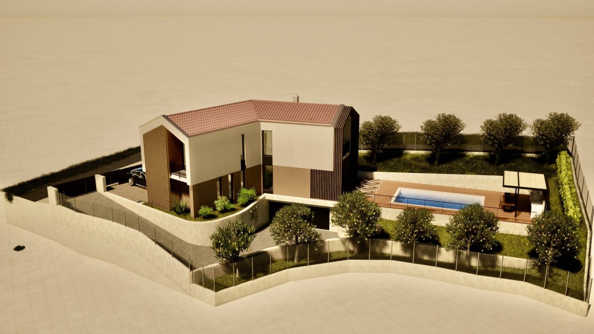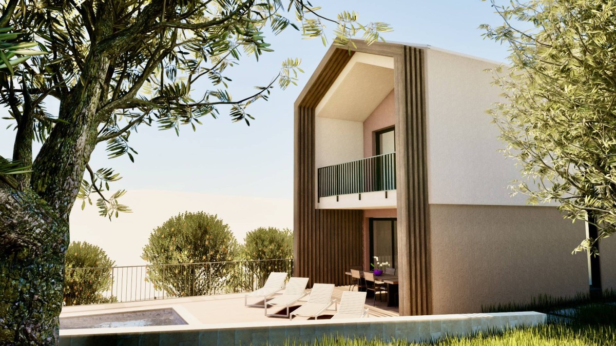 Das Projekt ist in einer 3D-Simulation sowie in Grundrissflächen und der Anordnung des Hauses sichtbar.