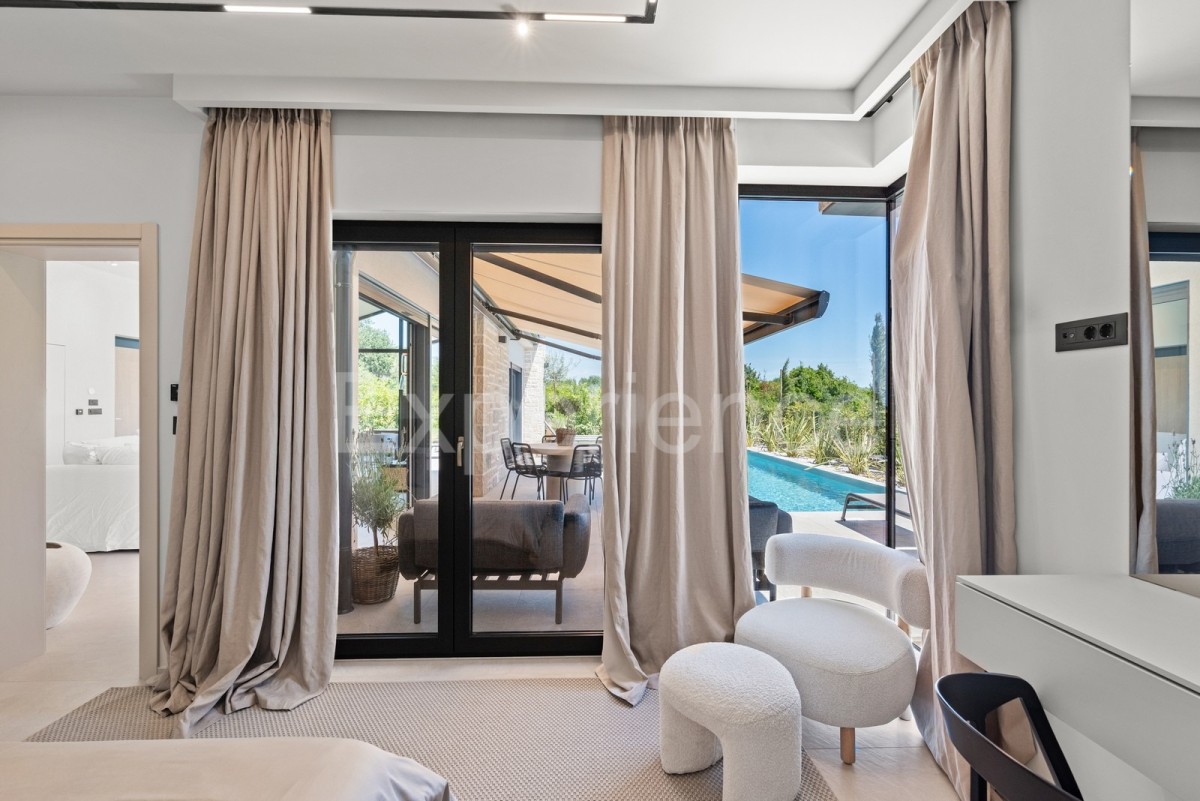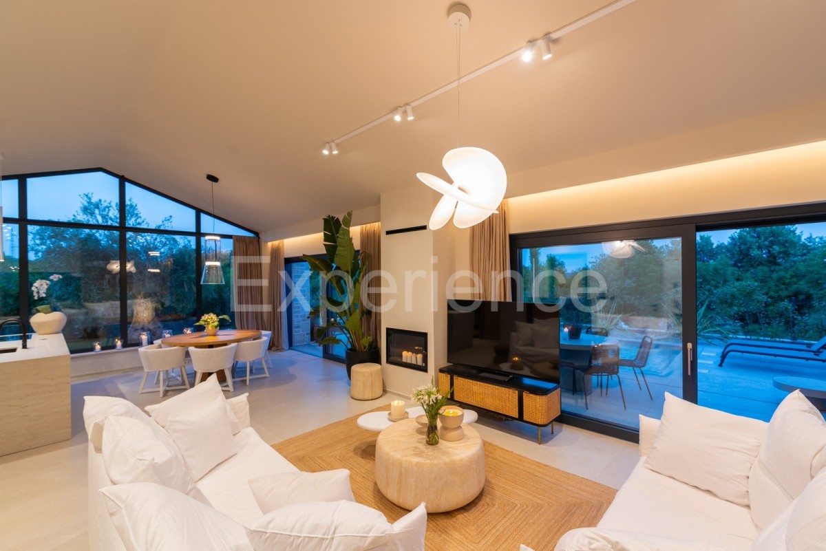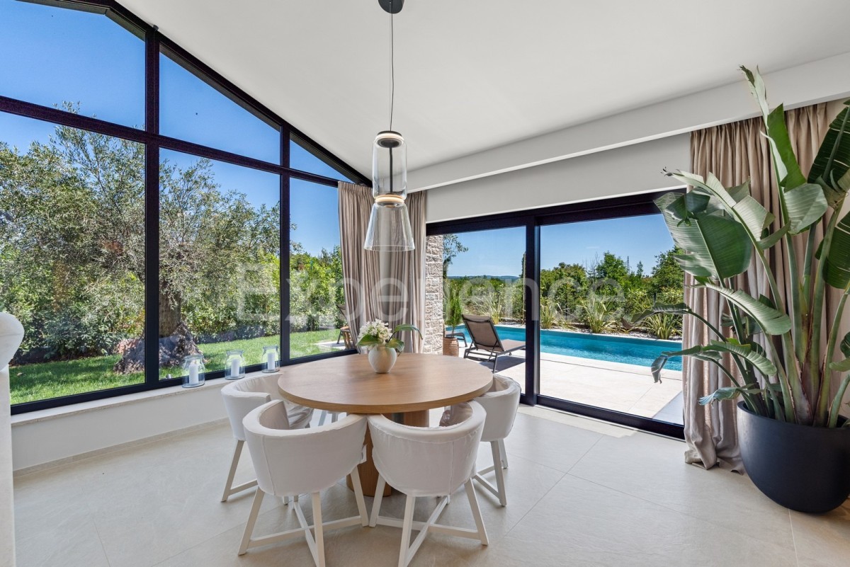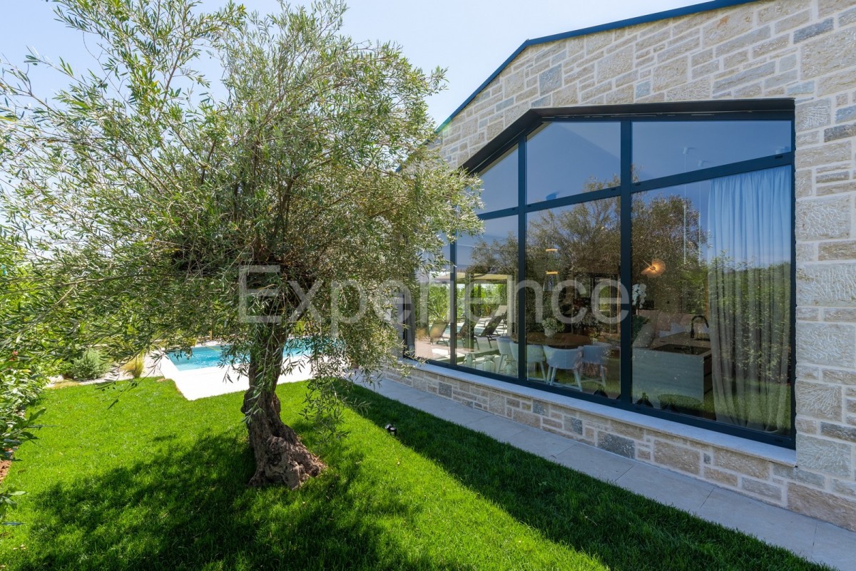 Eine moderne, ebenerdige Designervilla steht zum Verkauf, die traditionellen istrischen Stein perfekt mit einem eleganten, zeitgenössischen Stil verbindet. Die Villa befindet sich in einer ruhigen Gegend, nur wenige Autominuten vom Zentrum von Poreč und dem Meer entfernt und ist somit ideal für ein ruhiges Leben mit allen Annehmlichkeiten in unmittelbarer Nähe. Interieur und Exterieur: • Wohnfläche: 137 m², • Großzügiger, beheizter Swimmingpool: 44 m², • Landschaftsgarten: 500 m², • Parkplätze mit Lademöglichkeit für Elektrofahrzeuge. Die Villa strahlt dank hoher Decken und großer Glasfronten Großzügigkeit und Licht aus und bietet einen wunderschönen Blick auf die gepflegte Umgebung und den Pool – für ein einzigartiges mediterranes Ambiente. Raumaufteilung: • Offener Wohnbereich mit Küche, Esszimmer und Wohnzimmer mit Kamin, • Drei Schlafzimmer, jeweils mit eigenem Badezimmer, • Technikraum/Waschraum. Design und AusstattungDie Villa ist vollständig designerisch eingerichtet mit sorgfältig ausgewählten hochwertigen Möbeln und Geräten: • Elegantes Caruso-Sofa, Gervasoni-Sideboard, • Copat Life Küche mit Bora Bora Dunstabzugshaube und hochwertigen Miele-Geräten, • Smeg Kleingeräte, • Copat Life Esstisch und Flos Designerleuchten. Komfort und Technologie: • Fußbodenheizung über Wärmepumpe, • Inverter-Klimaanlagen zum Heizen und Kühlen, • Beheizter Swimmingpool und Sommerküche mit Grill und Kave Home Gartenmöbeln, • Videoüberwachung. Diese Villa ist eine ideale Gelegenheit für alle, die ein modernes und luxuriöses Zuhause in ruhiger Lage, nahe dem Meer und allen Einrichtungen suchen. Sie wird komplett möbliert und ausgestattet verkauft und ist sofort bezugsfertig oder kann als luxuriöse Ferienimmobilie vermietet werden.