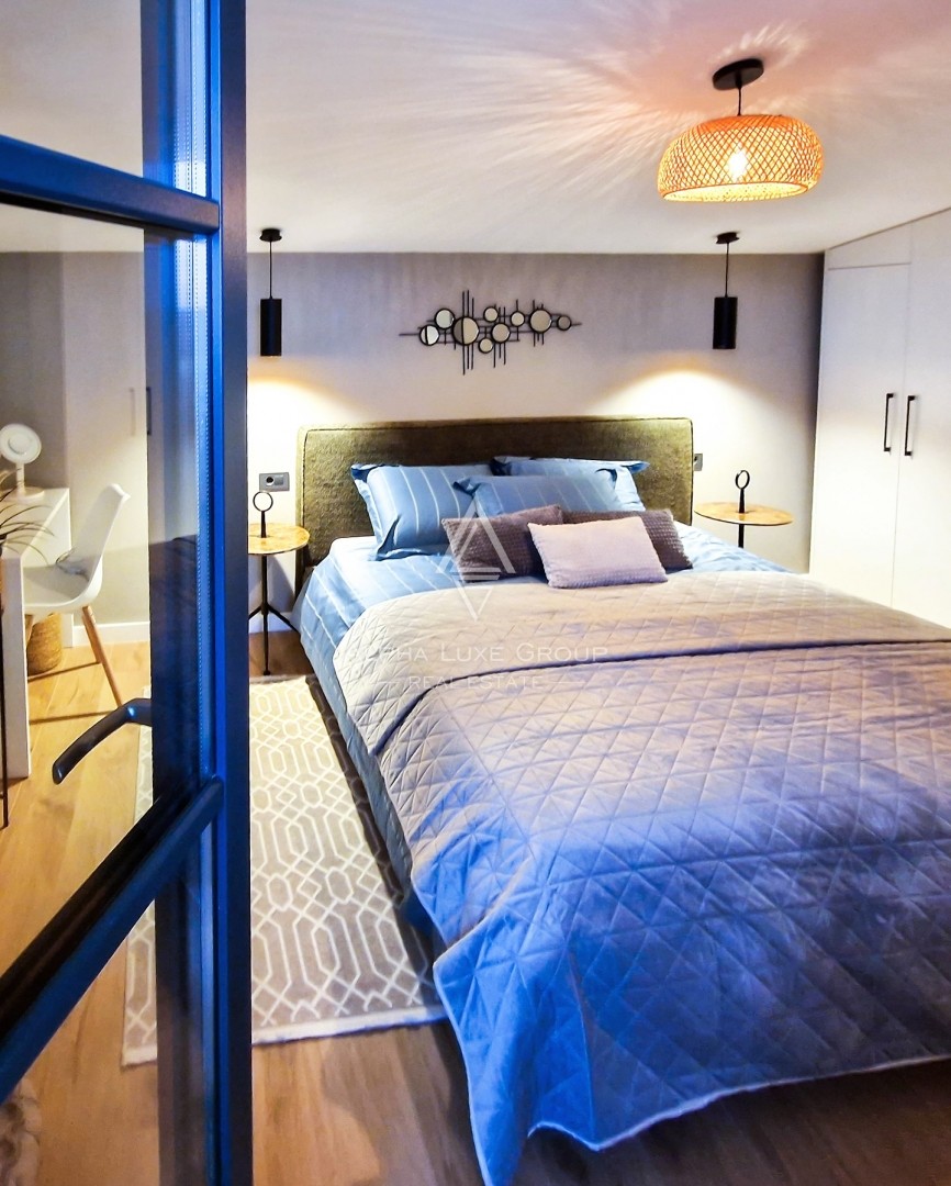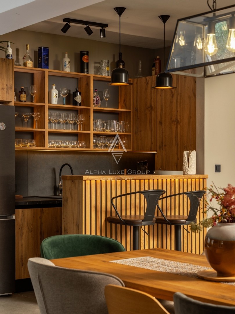 Die Villa wurde mit hochwertigen Materialien und handwerklicher Präzision gebaut. Auf zwei Etagen bietet sie vier großzügige Schlafzimmer – jedes mit eigenem Bad und privater Terrasse. Der offene Wohnbereich umfasst eine voll ausgestattete moderne Küche, ein Esszimmer und ein helles Wohnzimmer mit Kamin, das dem Raum Wärme und Eleganz verleiht. Ein separater Unterhaltungsraum mit privater Bar, großem Esstisch und direktem Zugang zum Poolbereich ist perfekt für gesellige Abende.