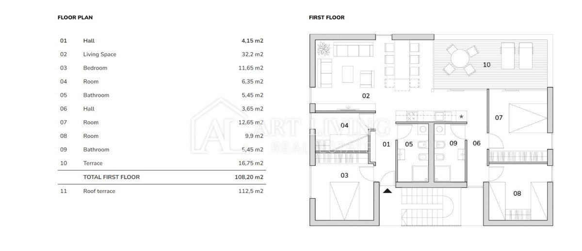 * Erster Stock = 108,20 m2 (91,45 m2 Fläche + 16,75 m2 Terrasse)