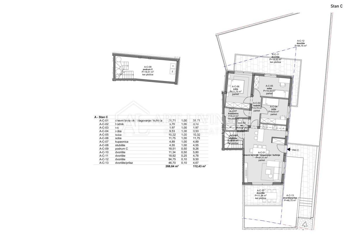 Die gesamte Nettofläche der Wohnung beträgt 112,43 m2 und besteht aus einer Eingangshalle mit Garderobe, einem geräumigen Wohnzimmer mit Küche und Esszimmer nach dem „Open Space“-Prinzip, dann drei geräumigen Schlafzimmern, einem Badezimmer und einem Toilette. Entlang des gesamten Wohnbereichs wurden Glaswände installiert, die den Raum den ganzen Tag über mit viel Licht versorgen. Das Wohnzimmer führt zu einer großzügigen überdachten Terrasse mit Zugang zu einem wunderschön angelegten Garten von 125 m2.