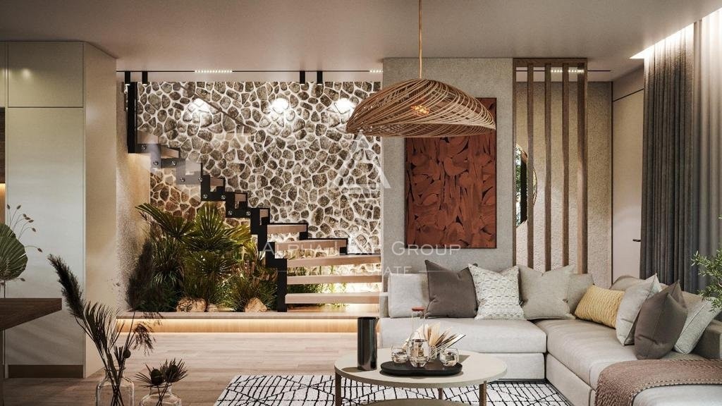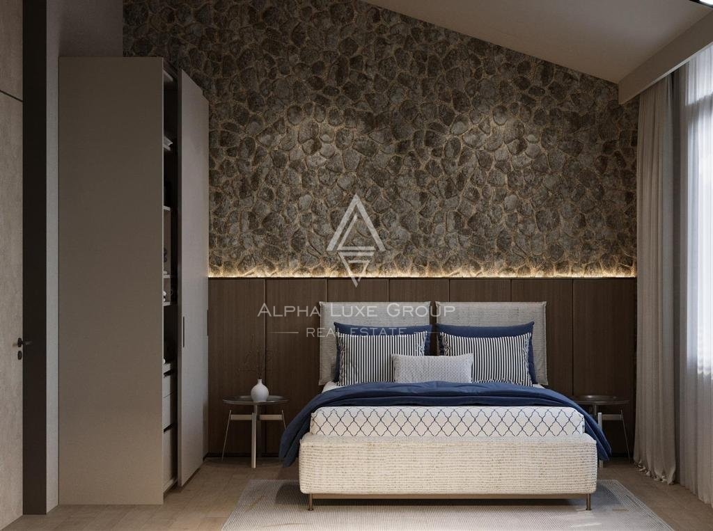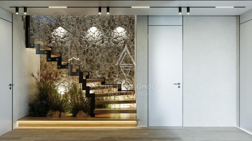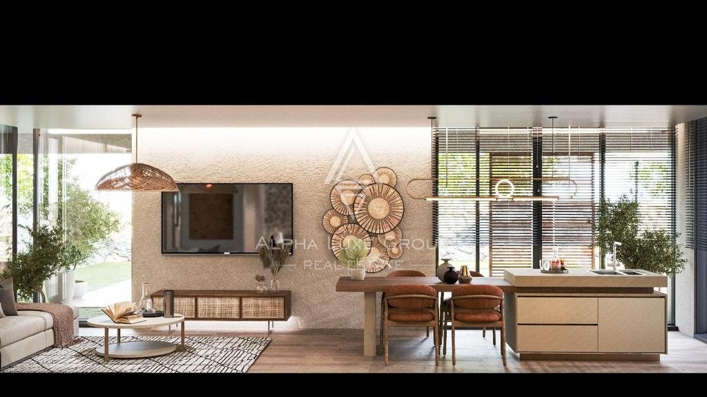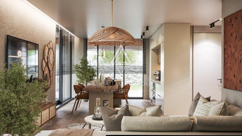 Das Haus erstreckt sich über zwei Etagen. Das Erdgeschoss umfasst einen offenen Wohnbereich mit Wohnzimmer, Essbereich und Küche, die direkten Zugang zu einer überdachten Terrasse bieten. Die Terrasse ist mit einer Sommerküche und einer Sauna ausgestattet, was ein harmonisches Indoor-Outdoor-Leben ermöglicht. Zusätzlich gibt es im Erdgeschoss ein Schlafzimmer, ein Gäste-WC und einen Technikraum.