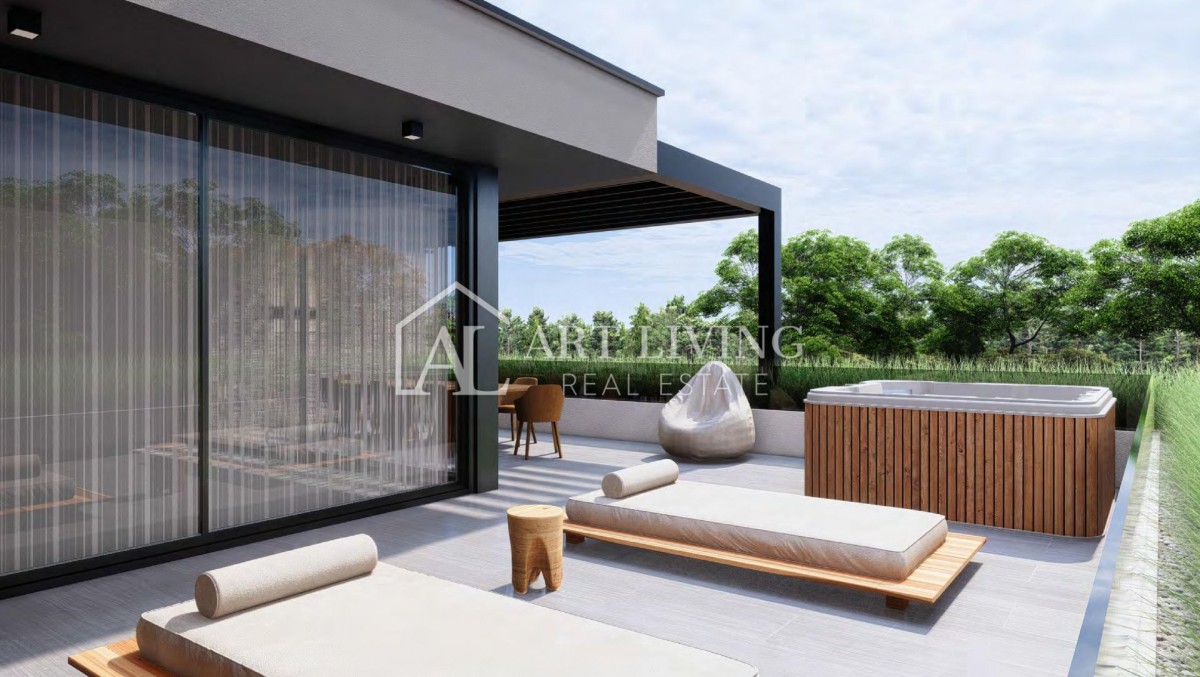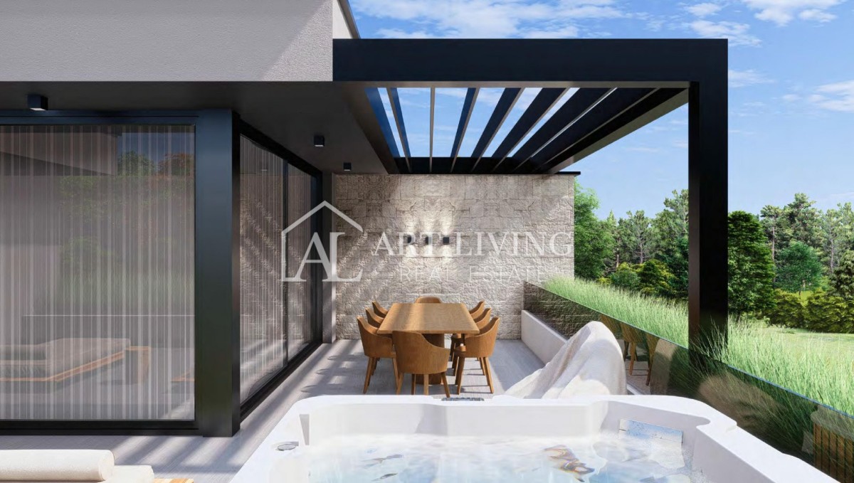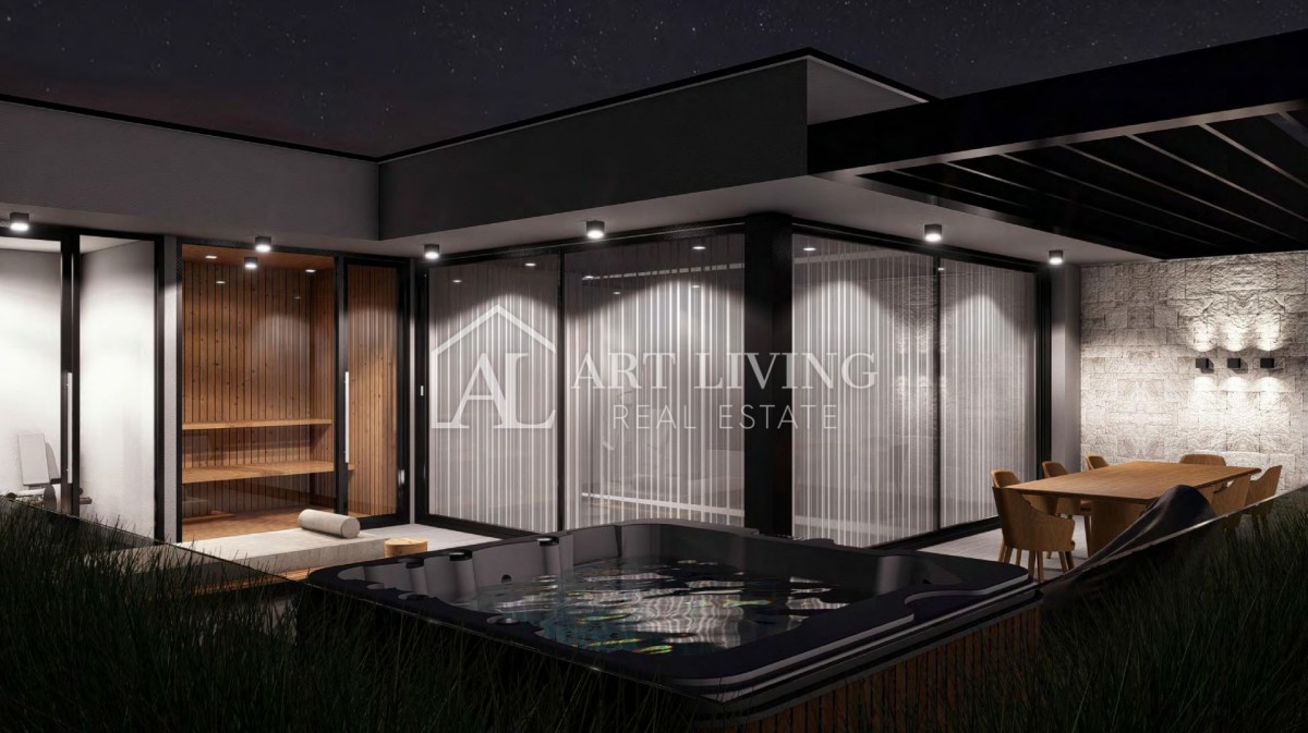 Wir steigen über die Außentreppe in den zweiten Stock hinauf, der aus einem Abstellraum, einem Badezimmer, einem offenen Raum zum Entspannen und einer Küche besteht, die Zugang zu einer Terrasse mit Esstisch, einer überdachten bioklimatischen Pergola sowie einem hat Liegewiese, Whirlpool, Fitnessraum und Sauna. Die Dachterrasse bietet einen wunderschönen Blick auf das Meer und die bezaubernde Landschaft Istriens