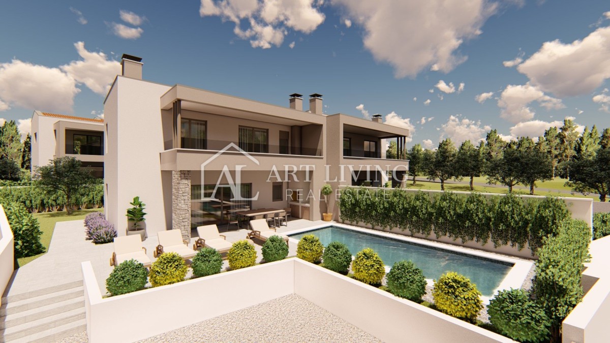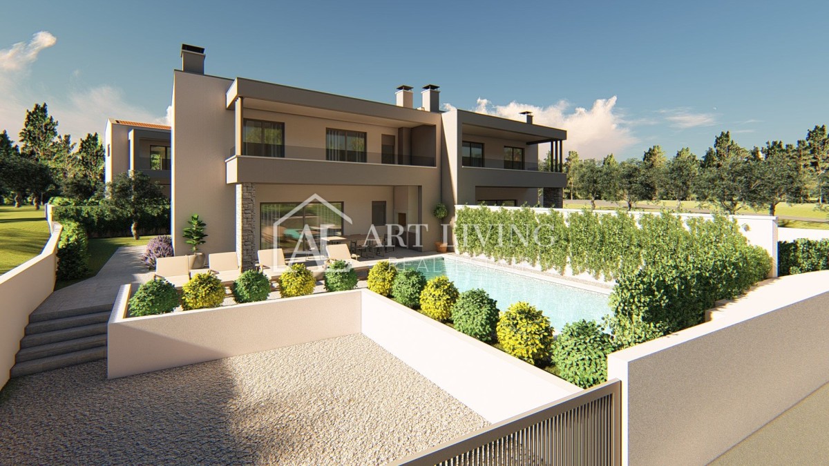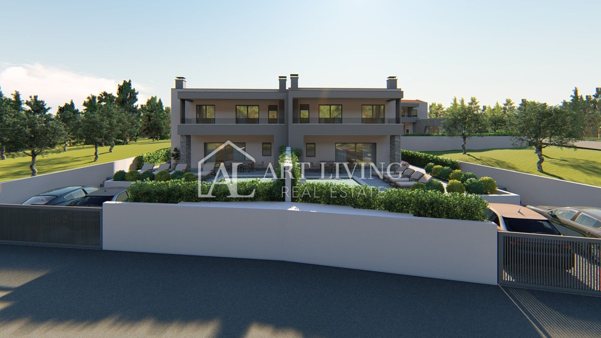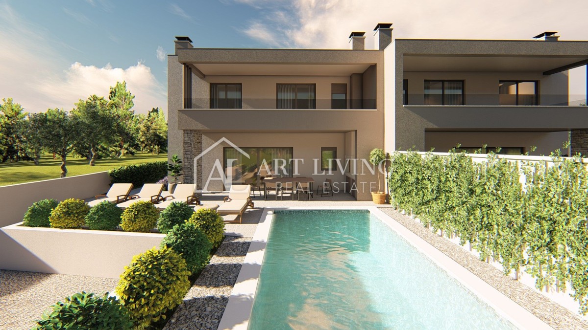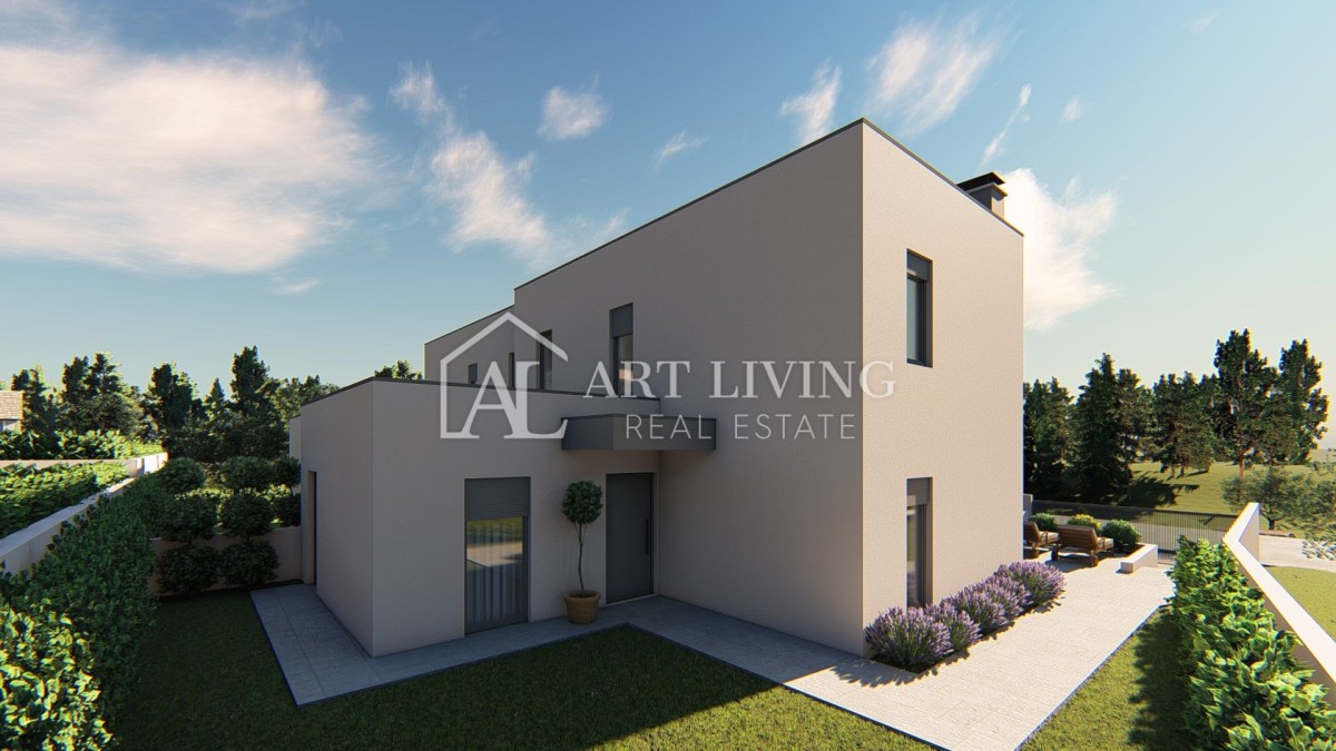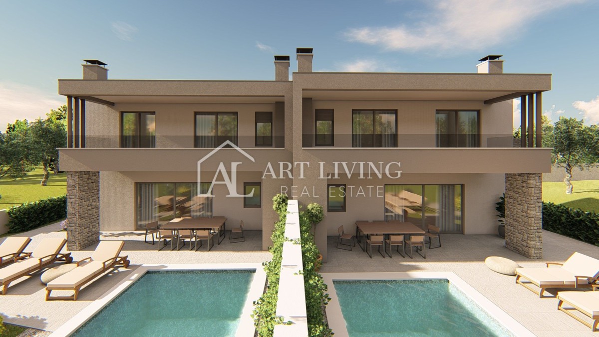 In einem ruhigen Dorf, nur 7 km von Poreč und nur 600 Meter vom Meer und gepflegten Stränden entfernt, steht eine hochwertige Doppelhaushälfte mit Swimmingpool zum Verkauf, mit einer Nettonutzfläche von 127 m2 Gartenfläche von 260 m2, einzigartiger Grundriss, modernes Design und hochwertige Bauweise.