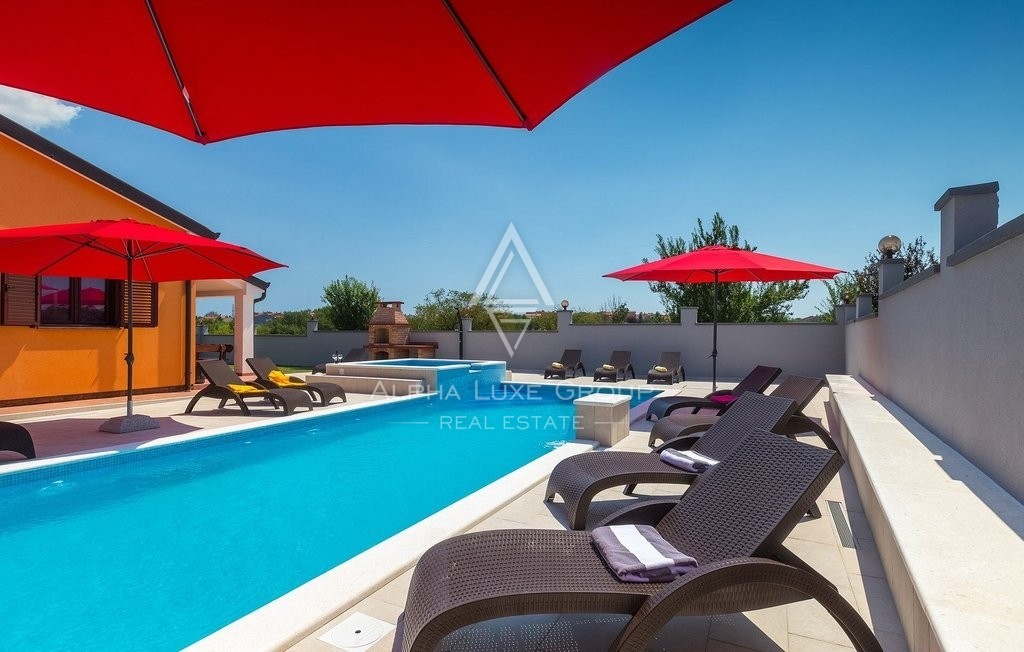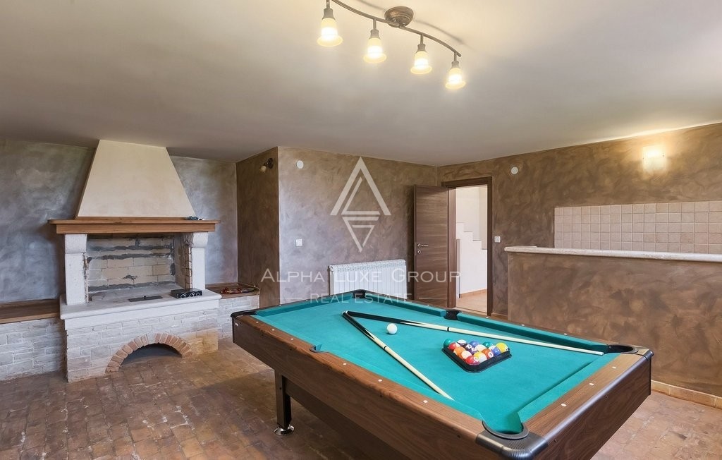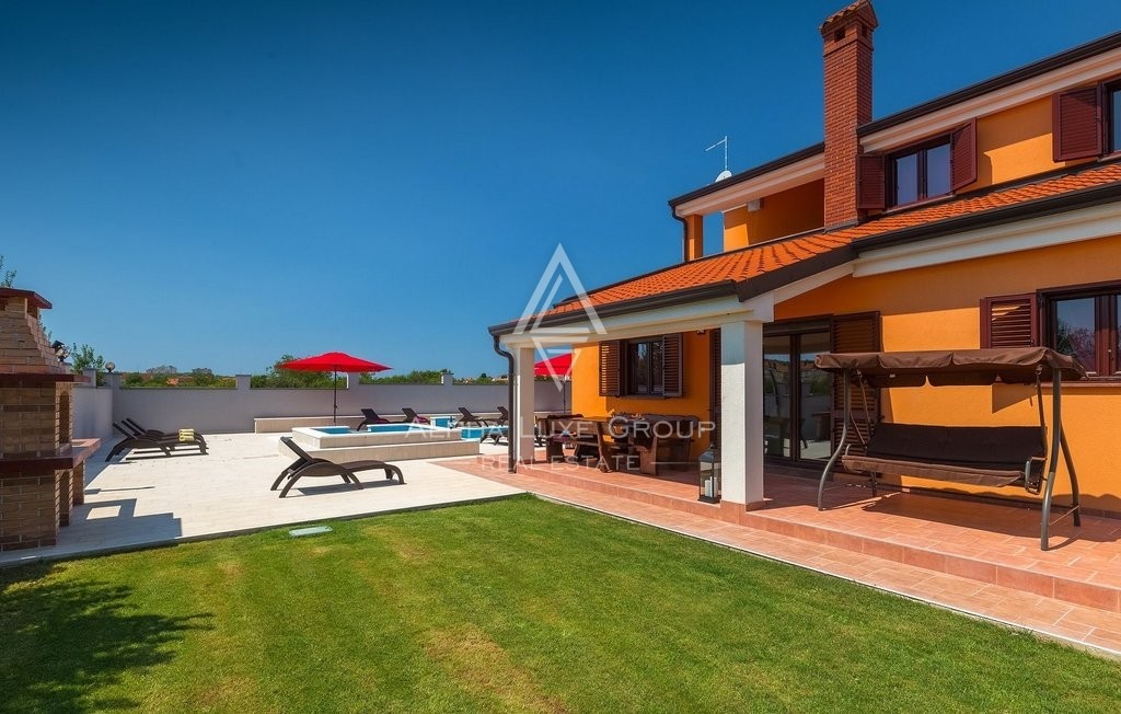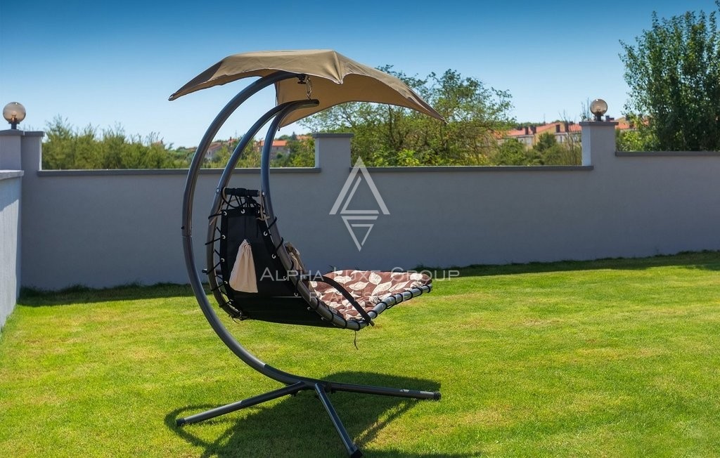 Der wunderschön gestaltete Garten umgibt einen großen Swimmingpool, einen Jacuzzi und eine charmante Sommerterrasse. Entspannende Gartenmöbel und eine Grillstelle machen diesen Außenbereich ideal, um das mediterrane Klima Istriens mit Familie und Freunden zu genießen.