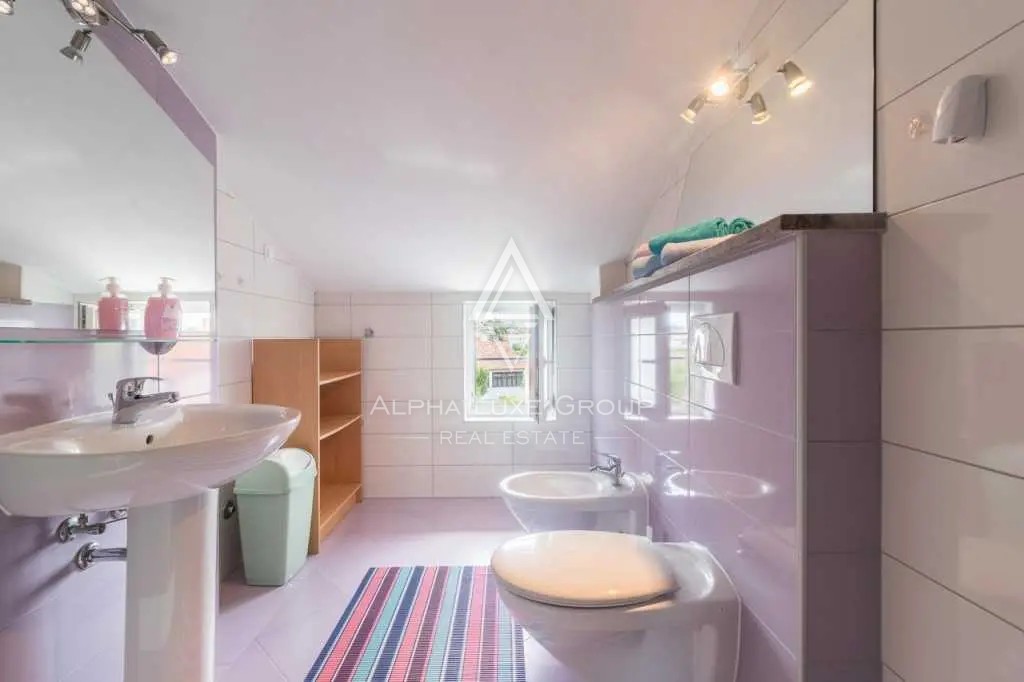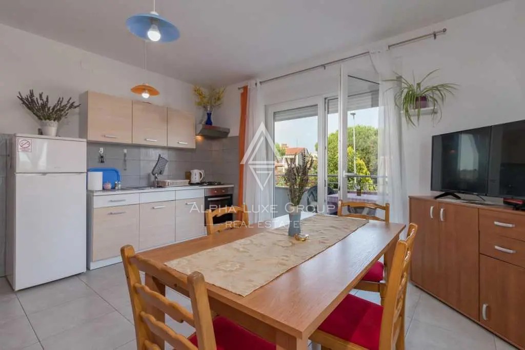 Das Gebäude erstreckt sich über zwei Etagen und umfasst vier gut gestaltete Wohneinheiten. Im Erdgeschoss befinden sich zwei kompakte Apartments, jeweils mit zwei Schlafzimmern, einem Badezimmer, einer Küche, einem Essbereich und einem hellen Wohnzimmer mit direktem Zugang zur Terrasse. Diese Einheiten eignen sich ideal für ganzjähriges Wohnen oder für touristische Vermietung.