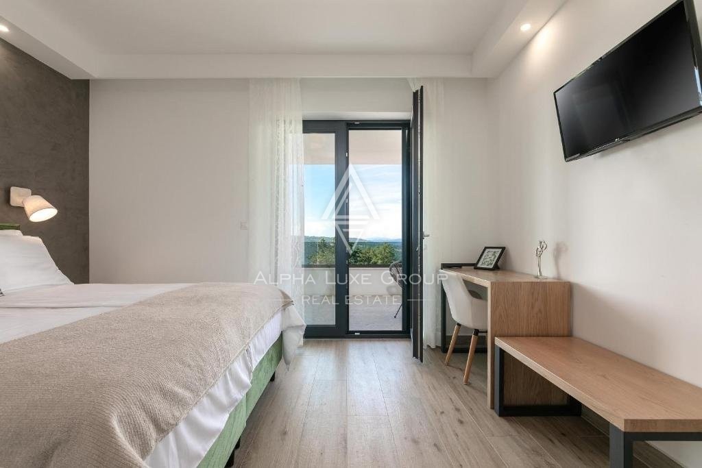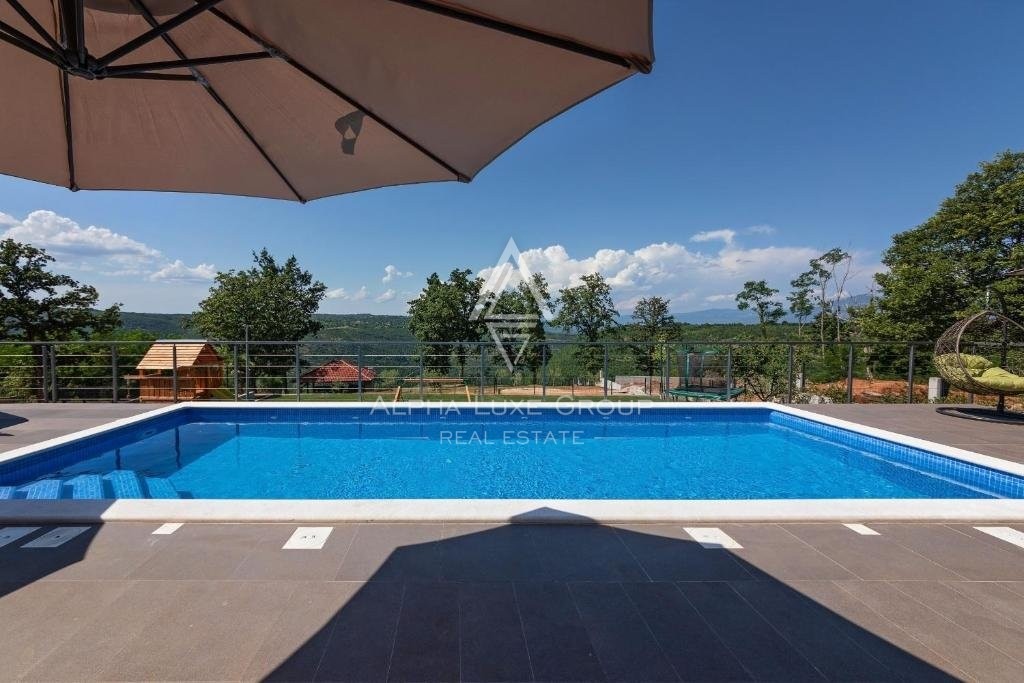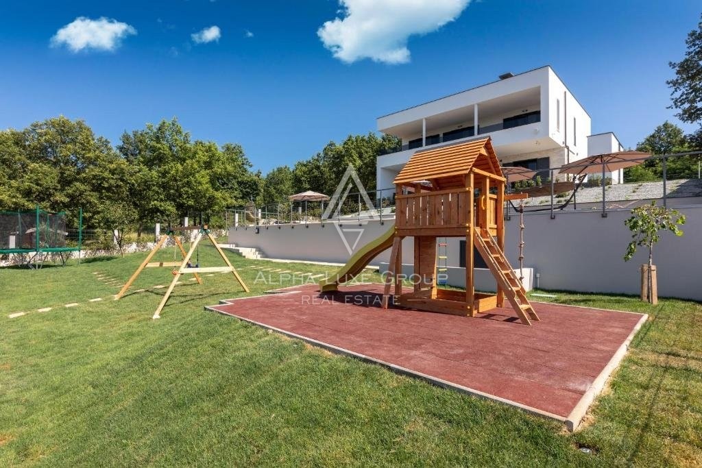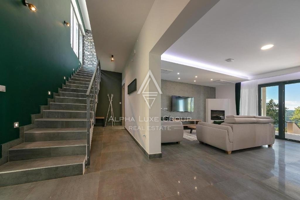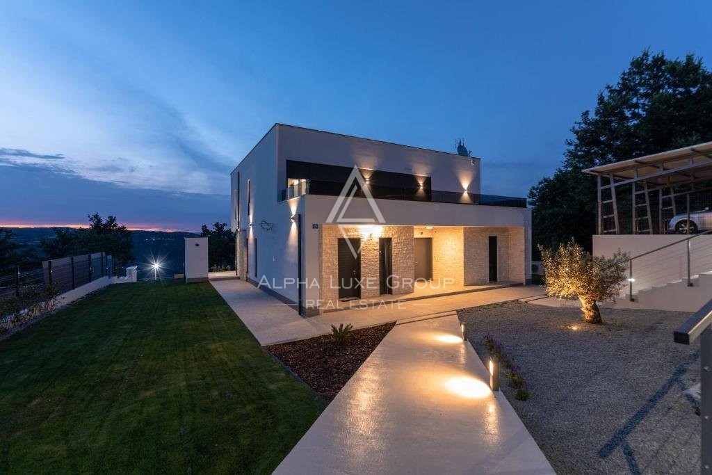 Zum Verkauf steht eine außergewöhnliche Villa, die moderne Architektur und höchste Bauqualität verkörpert, gelegen in einem malerischen istrischen Dorf, umgeben von einer atemberaubenden Naturlandschaft, Olivenhainen, verschiedenen Obstbäumen und Weinbergen, nur 12 km von den exquisiten Kieselstränden Rabacs entfernt.