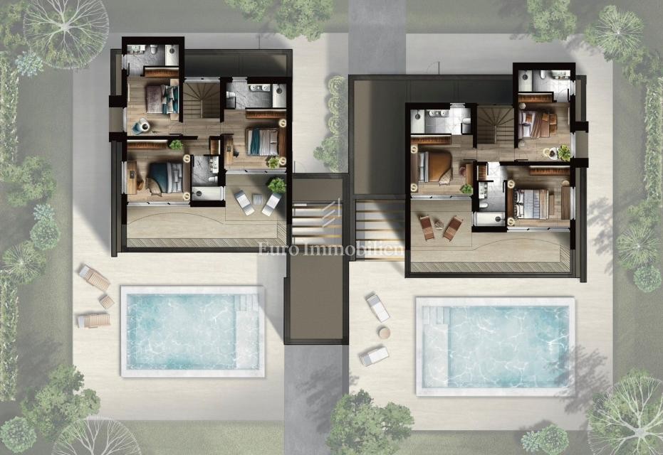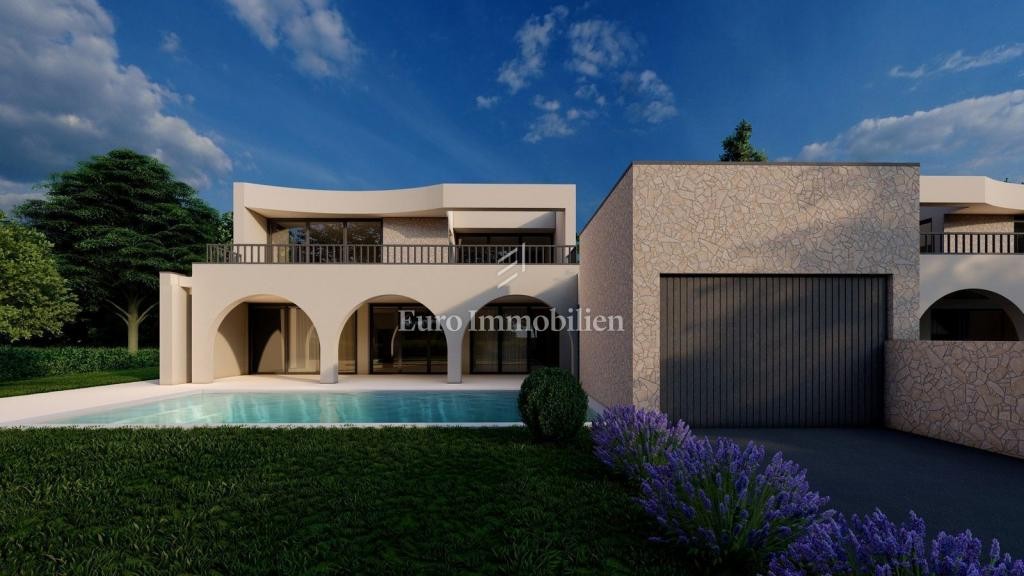 Der Investor plant den Bau dieses schönen Hauses in ruhiger Lage in der kleinen istrischen Stadt Kaštelir. Das Haus liegt mit Swimmingpool auf einem Grundstück von 617 m2. Es besteht aus einem Erdgeschoss und einem ersten Stock mit einer Gesamtfläche von 203,55 m2. Das Erdgeschoss verfügt über eine Eingangshalle, ein Wohnzimmer, eine Küche, ein Esszimmer, ein Schlafzimmer und ein Badezimmer. Vom Wohnzimmer, das nach Süden und Westen ausgerichtet ist, hat man Zugang zu einer großzügigen überdachten Terrasse mit einer Sommerküche von 31,92 m2 und einem angelegten Garten mit Swimmingpool. Im ersten Stock befinden sich drei weitere Schlafzimmer, jedes mit eigenem Bad, und eine große überdachte Terrasse von 40,42 m2. Die Fußbodenheizung erfolgt mittels Wärmepumpe, außerdem werden Klimaanlagen mit Heiz- und Kühlsystem installiert. Die Zimmerei besteht aus hochwertigem Aluminium. Es stehen zwei Parkplätze für Autos zur Verfügung und die Villa verfügt über eine Garage für ein Fahrzeug.