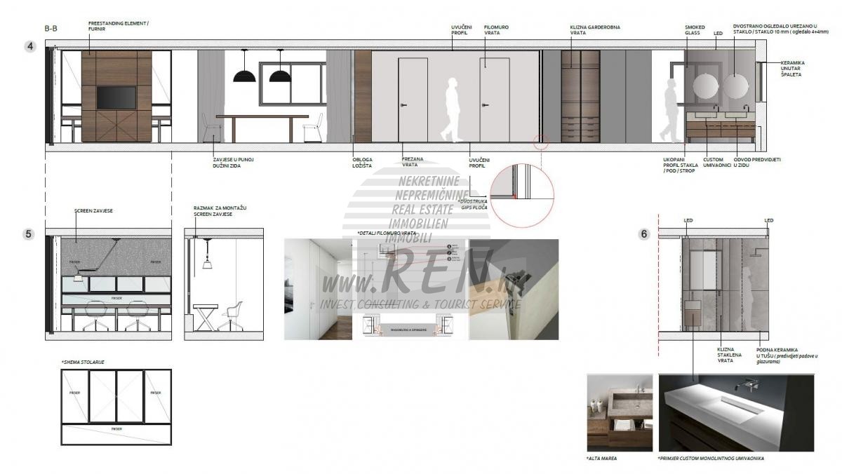 Das Apartment ist luxuriös mit maßgefertigten Möbeln eingerichtet, die sowohl Funktionalität als auch Ästhetik gewährleisten. Der Raum ist durchdacht gestaltet, um das natürliche Licht und den Meerblick zu maximieren. Der Hauptwohnbereich umfasst: