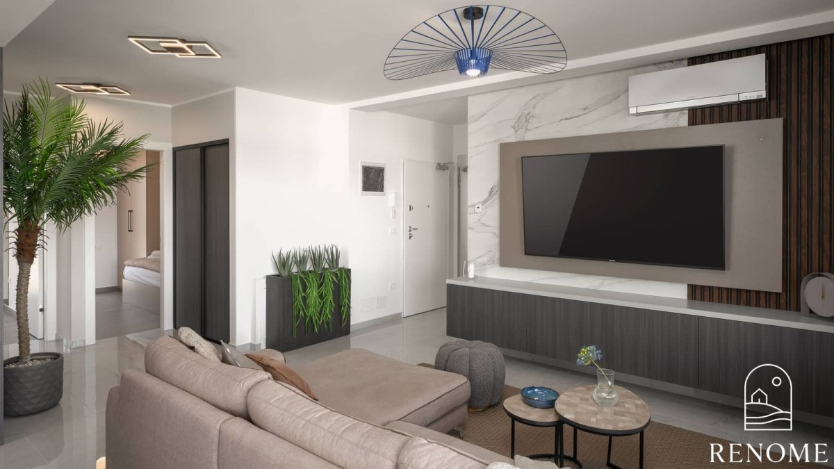 Der großzügige, offene Wohnbereich umfasst ein elegantes Wohnzimmer mit großem Smart-TV, eine moderne Küche mit Kochinsel und einen voll ausgestatteten Essbereich.