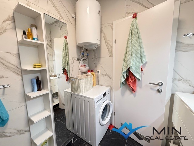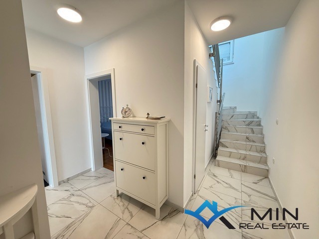 Zum Verkauf steht eine komfortable Wohnung in einer sehr gefragten Lage in Novigrad, in unmittelbarer Nähe zu allen Annehmlichkeiten. Die Wohnung ist nur 400 Meter vom Meer und einem schön angelegten Strand sowie 500 Meter vom Stadtzentrum entfernt. Sie verfügt über eine Wohnfläche von 101,90 m² und erstreckt sich über zwei Etagen. Im ersten Stock befinden sich ein WC, ein Badezimmer, ein Abstellraum und drei Schlafzimmer, von denen zwei Zugang zu einer gemeinsamen, überdachten Terrasse haben. Im Dachgeschoss gibt es einen offenen Wohnbereich mit Küche, Essbereich und Wohnzimmer, der auf eine Terrasse führt, von der aus man einen teilweisen Meerblick genießt. Die Terrasse ist mit einer Pergola mit beweglichem Dach ausgestattet, das über eine Fernbedienung gesteuert wird. Zur Wohnung gehört außerdem ein überdachter Parkplatz mit einer Fläche von 12,50 m².