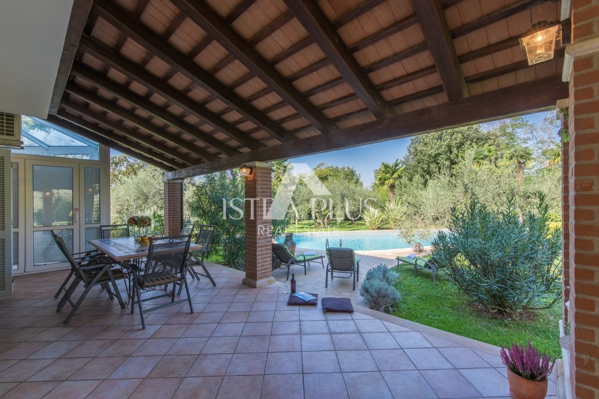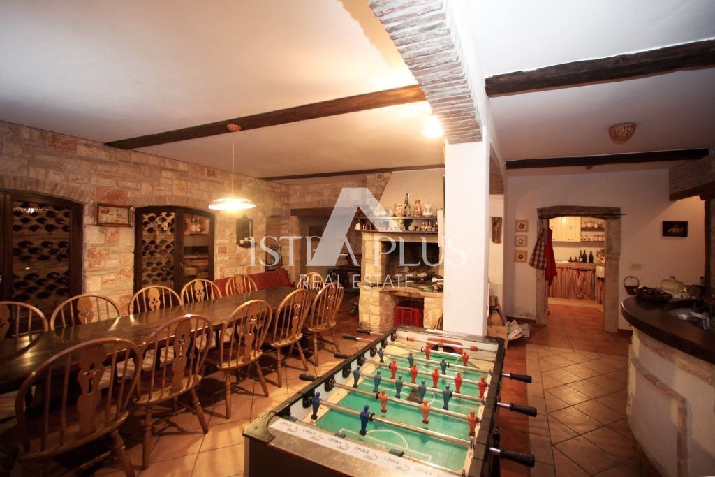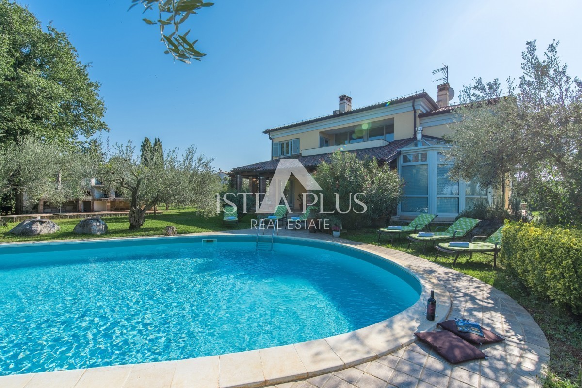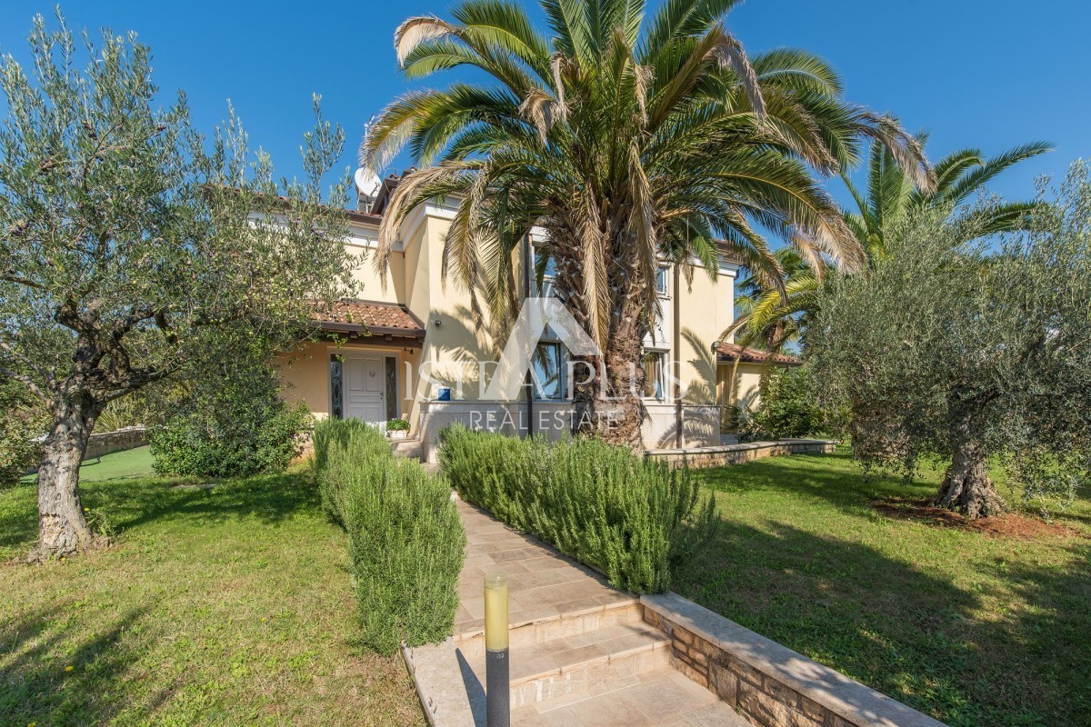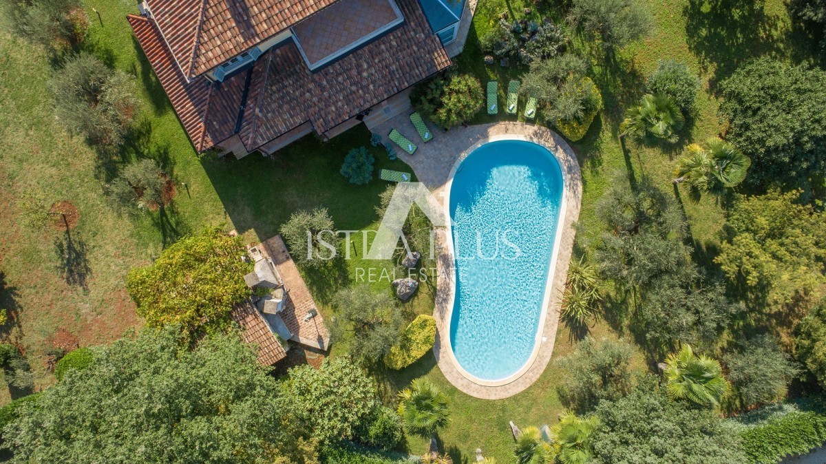 Eine wunderschöne Villa in Poreč, in einem ruhigen Dorf inmitten der Natur, 1 km vom Meer entfernt. Fläche 420m2, verteilt auf drei Etagen. Im Keller des Hauses finden Sie etwas Besonderes und Wertvolles: eine traditionelle istrische Taverne mit einer kleinen Steinbar, ein großes Esszimmer mit Kamin, eine ausgestattete Küche, eine Toilette und einen gläsernen Weinkeller. Die Taverne ist mit dem Rest des Hauses verbunden, sodass die Treppe in das Erdgeschoss des Hauses führt. Es besteht aus zwei Schlafzimmern und zwei Badezimmern mit Duschen, einem geräumigen Wohnzimmer mit Kamin, das Zugang zum Wintergarten und zum Hof des Hauses hat, darunter befindet sich ein Esszimmer und eine Küche mit Abstellraum. Im ersten Stock befinden sich drei weitere Schlafzimmer, eines davon mit Zugang zum Balkon, das über ein eigenes luxuriöses Badezimmer mit Badewanne und Dusche sowie einen begehbaren Kleiderschrank verfügt. Im Flur der ersten Etage befindet sich ein zusätzliches Wohnzimmer, das als Arbeitsraum, Mini-Fitnessraum usw. genutzt werden kann und über einen Zugang zum Balkon verfügt. Am Eingang zum zweiten Badezimmer befindet sich ein komplett mit Einbauschränken ausgestatteter Raum, der zusätzlichen Platz für alles Notwendige schafft. Alle Zimmer und Schlafzimmer sind klimatisiert und werden mit Ölradiatoren beheizt. Der Abstellraum befindet sich im Keller des Hauses. Das Haus wird komplett möbliert und ausgestattet verkauft. Das Erdgeschoss führt zu einer großen überdachten Terrasse, einem Garten von ca. 1250m², einer Liegewiese und einem schönen Pool von 77 m².
