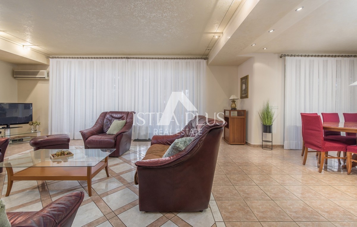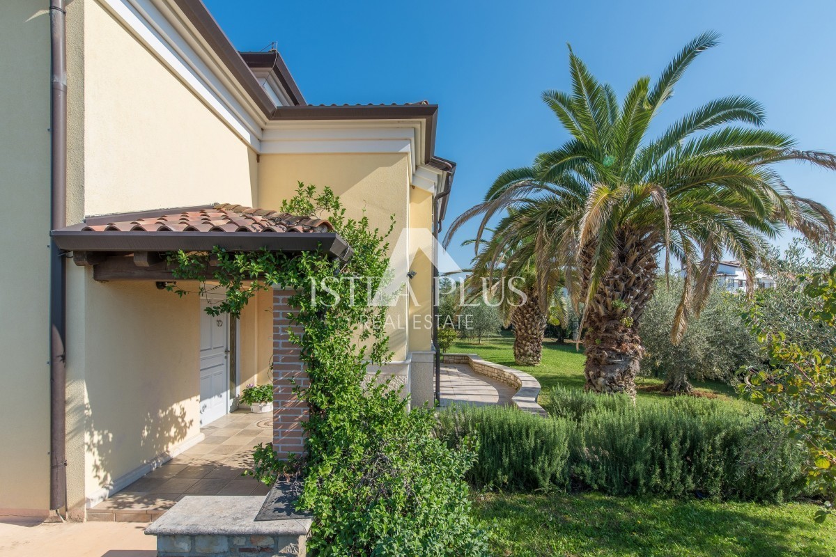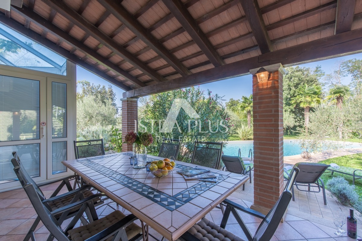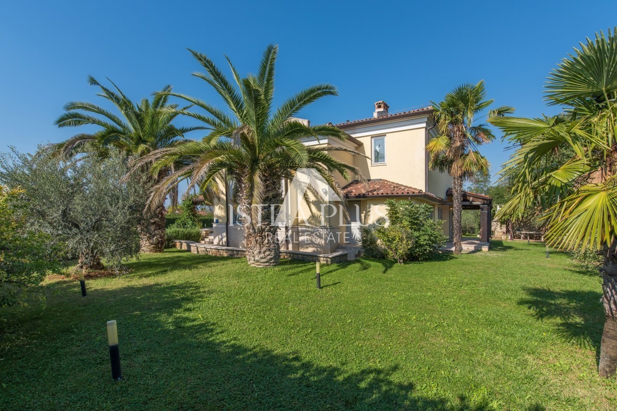 Eine wunderschöne Villa in Poreč, in einem ruhigen Dorf inmitten der Natur, 1 km vom Meer entfernt. Fläche 420m2, verteilt auf drei Etagen. Im Keller des Hauses finden Sie etwas Besonderes und Wertvolles: eine traditionelle istrische Taverne mit einer kleinen Steinbar, ein großes Esszimmer mit Kamin, eine ausgestattete Küche, eine Toilette und einen gläsernen Weinkeller. Die Taverne ist mit dem Rest des Hauses verbunden, sodass die Treppe in das Erdgeschoss des Hauses führt. Es besteht aus zwei Schlafzimmern und zwei Badezimmern mit Duschen, einem geräumigen Wohnzimmer mit Kamin, das Zugang zum Wintergarten und zum Hof des Hauses hat, darunter befindet sich ein Esszimmer und eine Küche mit Abstellraum. Im ersten Stock befinden sich drei weitere Schlafzimmer, eines davon mit Zugang zum Balkon, das über ein eigenes luxuriöses Badezimmer mit Badewanne und Dusche sowie einen begehbaren Kleiderschrank verfügt. Im Flur der ersten Etage befindet sich ein zusätzliches Wohnzimmer, das als Arbeitsraum, Mini-Fitnessraum usw. genutzt werden kann und über einen Zugang zum Balkon verfügt. Am Eingang zum zweiten Badezimmer befindet sich ein komplett mit Einbauschränken ausgestatteter Raum, der zusätzlichen Platz für alles Notwendige schafft. Alle Zimmer und Schlafzimmer sind klimatisiert und werden mit Ölradiatoren beheizt. Der Abstellraum befindet sich im Keller des Hauses. Das Haus wird komplett möbliert und ausgestattet verkauft. Das Erdgeschoss führt zu einer großen überdachten Terrasse, einem Garten von ca. 1250m², einer Liegewiese und einem schönen Pool von 77 m².