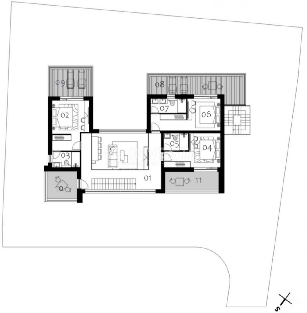 Das zentrale Element der Villa ist ein beeindruckendes, offen gestaltetes Wohnzimmer mit einer Deckenhöhe von bis zu 6 Metern und einer Innen Galerie, das dem Raum außergewöhnliche Luftigkeit und Exklusivität verleiht. Das Wohnzimmer ist mit der Küche und dem Essbereich verbunden und geht nahtlos auf großzügige überdachte und offene Terrassen über, wodurch eine perfekte Verbindung von Innen- und Außenbereich entsteht. Im Erdgeschoss befinden sich zudem ein Schlafzimmer mit eigenem Bad, ein Gäste-WC, ein zusätzliches Pool-WC, ein Technikraum mit Waschmöglichkeit, Innen- und Außenlager sowie eine Treppe, die alle Etagen verbindet. Auf dem Grundstück stehen zwei überdachte und zwei offene Parkplätze sowie ein sehr großzügiger Garten mit beheiztem Pool zur Verfügung, ideal zum Entspannen und für geselliges Beisammensein.