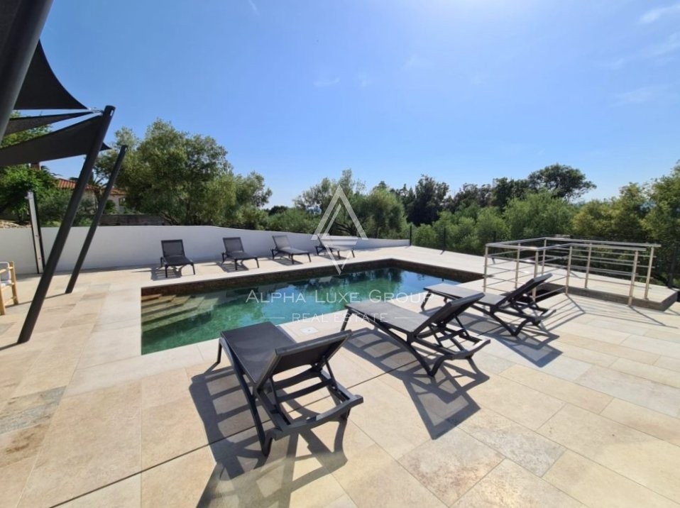 Angrenzend an die Villa befindet sich ein 32 m2 großer beheizter Pool mit Sonnendeck und Loungebereich. Der Hof ist durchdacht angelegt und rundherum eingezäunt.