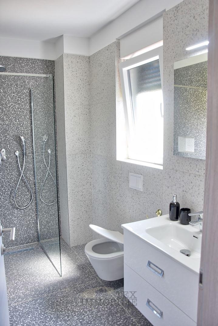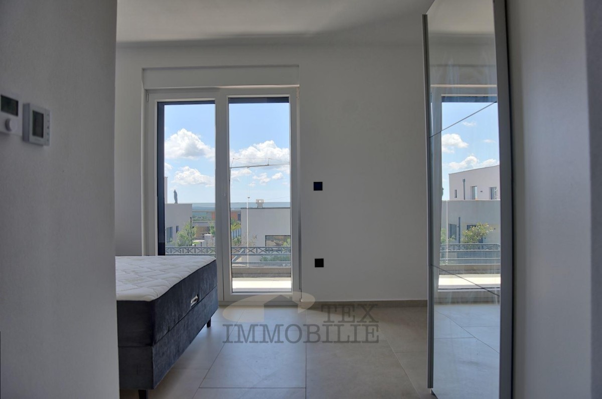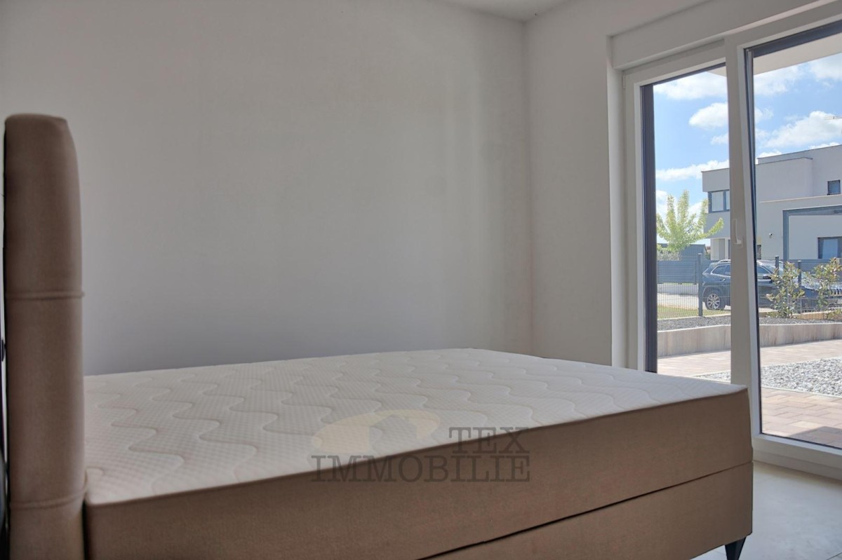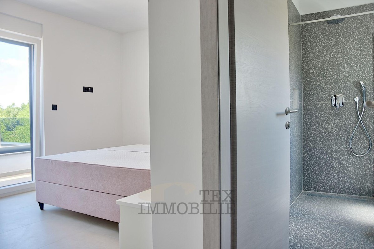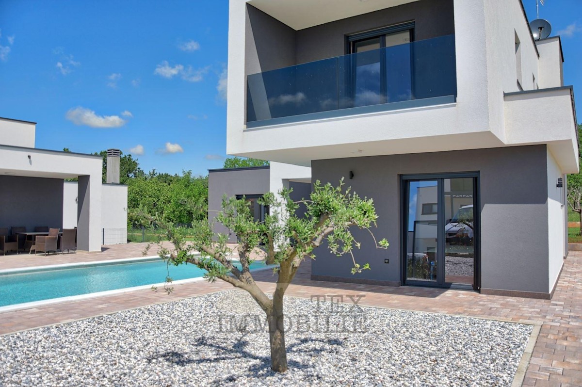 In einer wunderschönen und ruhigen Lage in der Nähe von Porec und nur 10 km vom Meer entfernt entsteht eine moderne Villa mit Swimmingpool. Das Haus (215 m2) im Erdgeschoss enthält ein Schlafzimmer mit Bad, Gästetoilette, Abstellraum, Wohnzimmer, Esszimmer und Küche. Der erste Stock besteht aus drei Schlafzimmern mit eigenen Bädern, einem Arbeitszimmer und einer Terrasse. Geplant ist eine zentrale Fußbodenheizung mit Wärmepumpe und Kühlung mit einem Fan-Coil-System. Der Garten enthält zwei Parkplätze, einen Swimmingpool (36 m2), gepflasterte Wege, Terrassen und einen Bereich zum Sonnenbaden rund um den Pool, eine Sommerküche mit Holzkamin und Steinspüle, eine Grünfläche mit automatischer Bewässerung und eingesätem Gras, ein eisernes Eingangstor mit automatischer Öffnung, eine Betonzaunmauer.