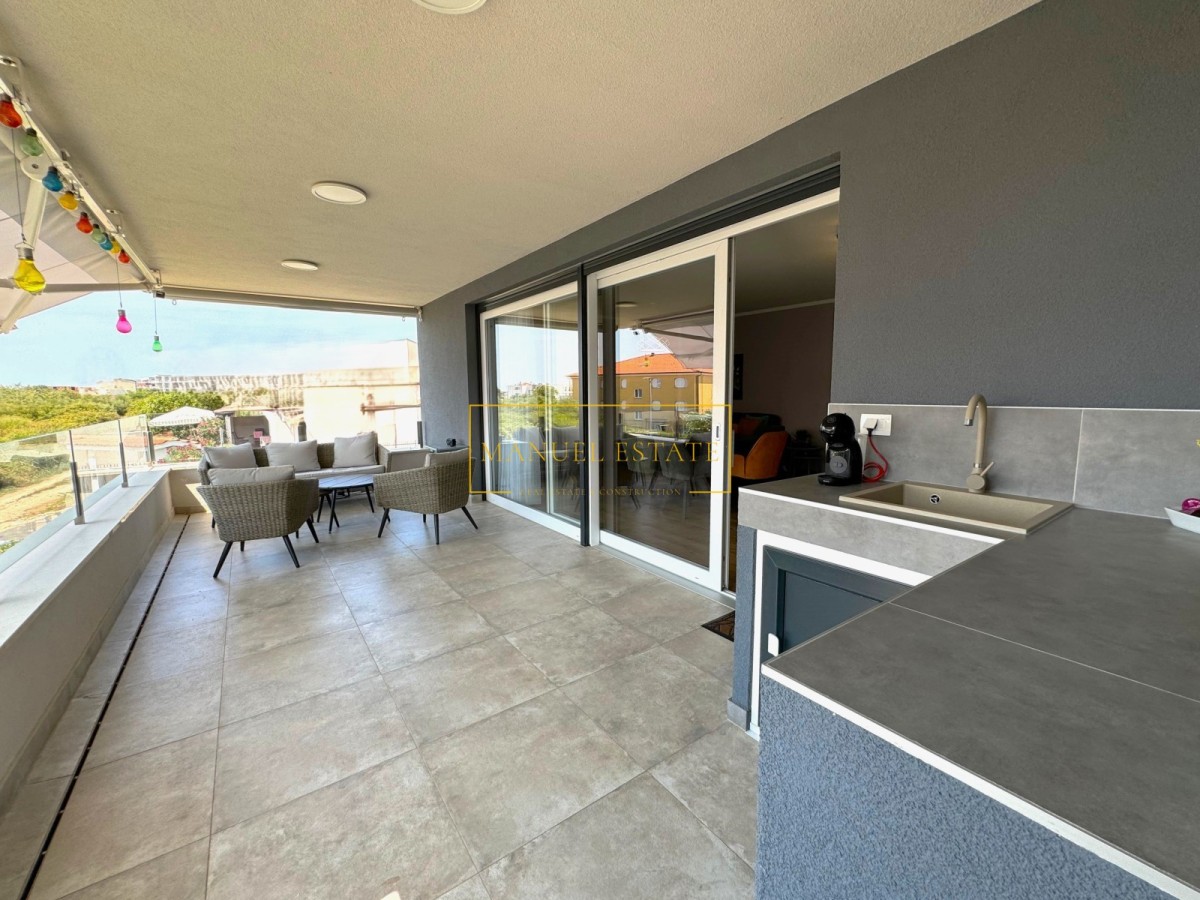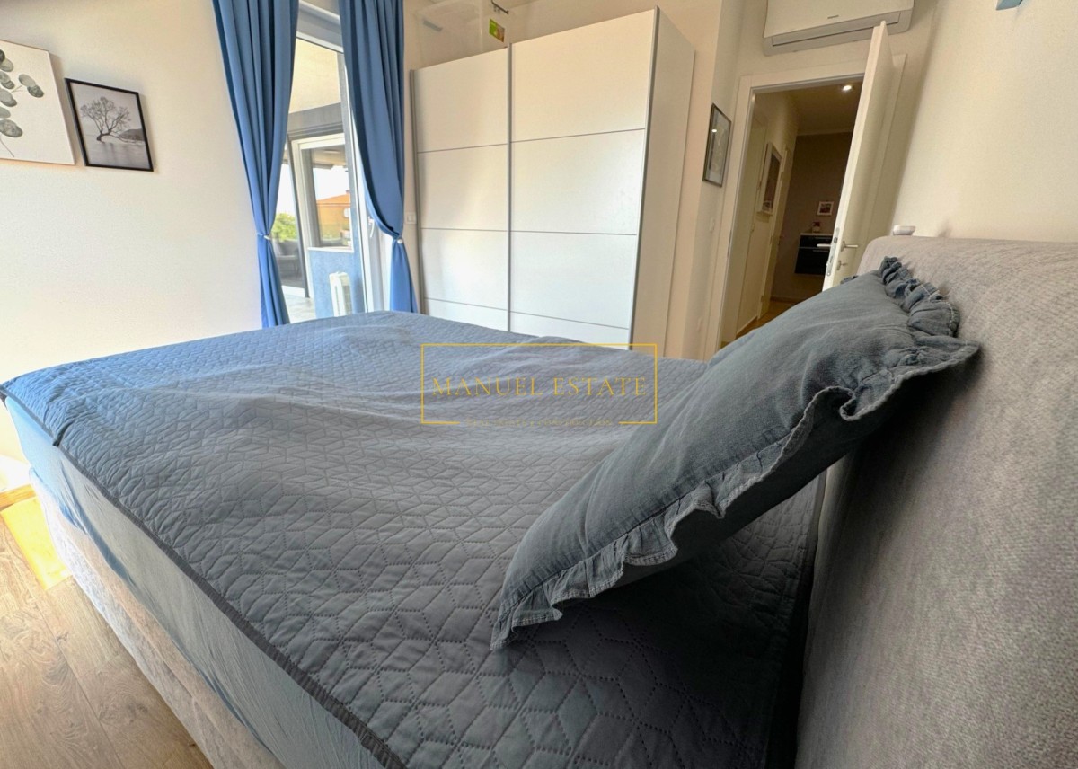 Eine geräumige, modern eingerichtete Wohnung von 85 m2, in unmittelbarer Nähe der Stadt und des Meeres, in Novigrad. Es befindet sich im ersten Stock und besteht aus einer Eingangshalle, einem Abstellraum, einer Toilette, einem Badezimmer, 2 Schlafzimmern, von denen eines Zugang zu einer überdachten Terrasse hat, sowie einem Wohnzimmer, einer Küche und einem Esszimmer mit Glaswänden und Zugang zu einer Terrasse mit Blick auf das Meer. Auf der Terrasse gibt es auch eine Sommerküche. Die Fußbodenheizung ist elektrisch und die Kühlung erfolgt über eine Klimaanlage. Die Wohnung wird möbliert verkauft. Es verfügt über einen Parkplatz. Das Stadtzentrum und das Meer sind ca. 1000 Meter entfernt. Die Wohnung kann zu Wohn- oder Touristenzwecken genutzt werden.