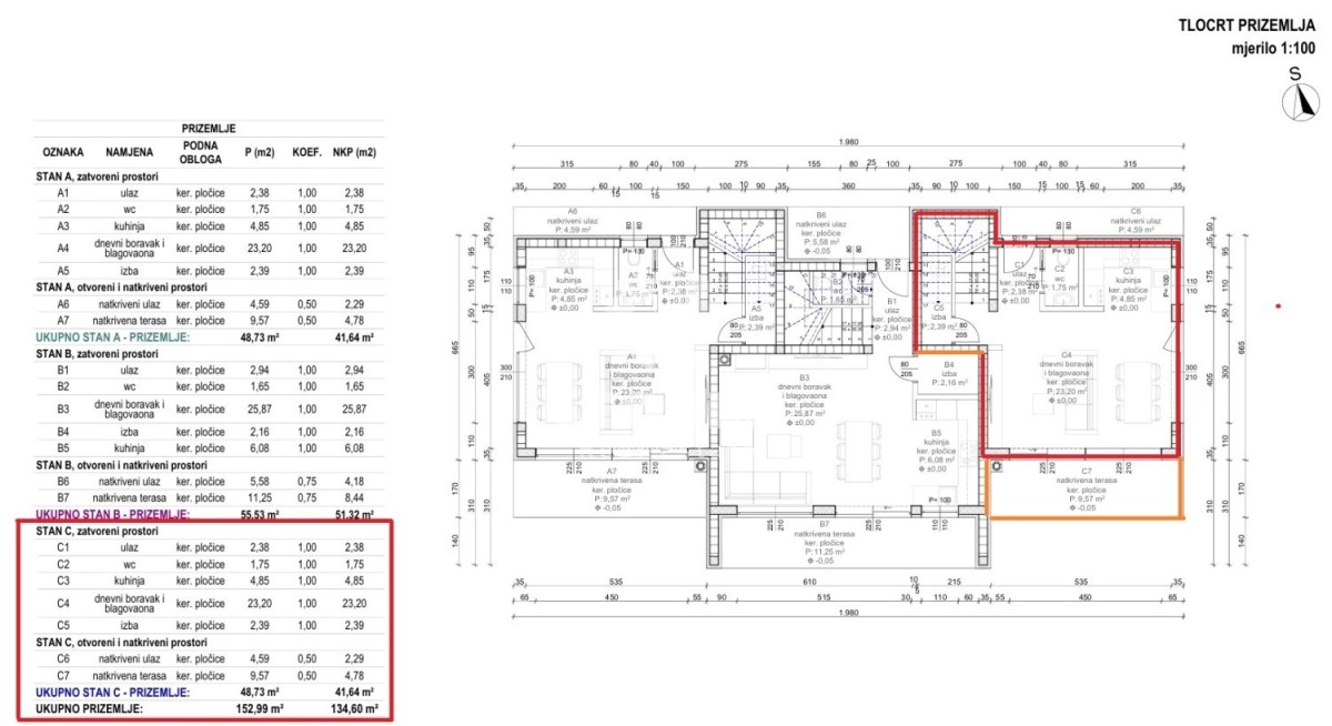 Modernes Reihenhaus zum Verkauf (Einheit C) in der Nähe von Umag. Die Nettonutzfläche des Hauses beträgt 117,38 m2, während die Fläche des Gartens etwa 200 m2 beträgt. Im Erdgeschoss gibt es eine Toilette, eine Speisekammer, eine Küche mit Esszimmer und ein Wohnzimmer mit Zugang zu einer überdachten Terrasse. Im ersten Stock befinden sich 2 Schlafzimmer, eines davon mit Zugang zur überdachten Terrasse und ein Badezimmer. Im zweiten Stock gibt es ein Schlafzimmer mit eigenem Bad und einer großen Terrasse mit Blick auf das Meer.