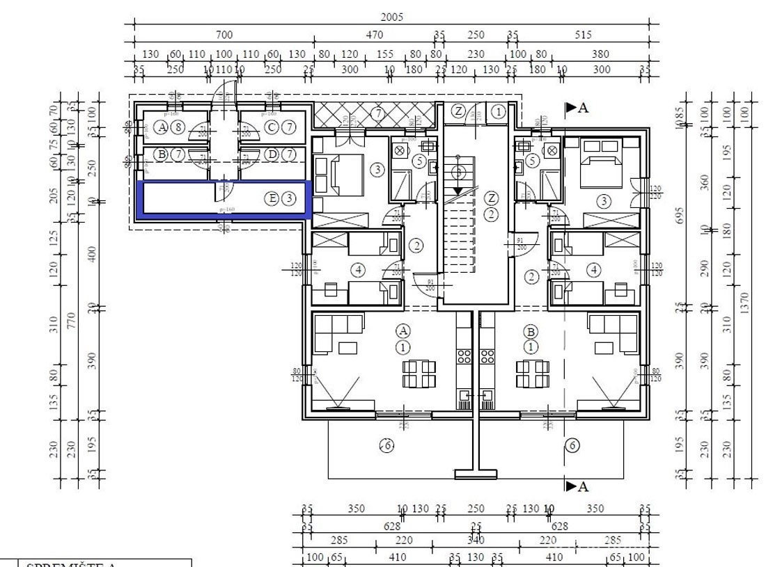 Wohnung E im zweiten Stock – Dachgeschoss, Nutzfläche 122,56 m² (Treppe, drei Schlafzimmer, zwei Badezimmer, Küche mit Wohnzimmer, Abstellraum und Terrasse). Abstellraum im Erdgeschoss 7,56 m².