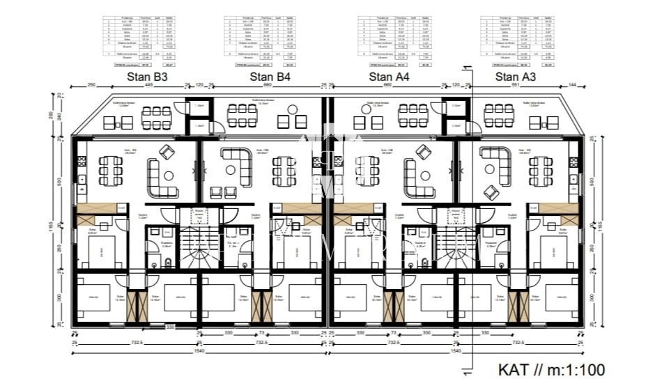 Das Apartment „A3“ befindet sich im 1. Stock dieses neuen modernen Gebäudes und besteht aus einem Flur, einem Wohnzimmer, einer Küche mit Essbereich und Zugang zu einer überdachten Terrasse, 3 Schlafzimmern, einem Badezimmer und einem Abstellraum.