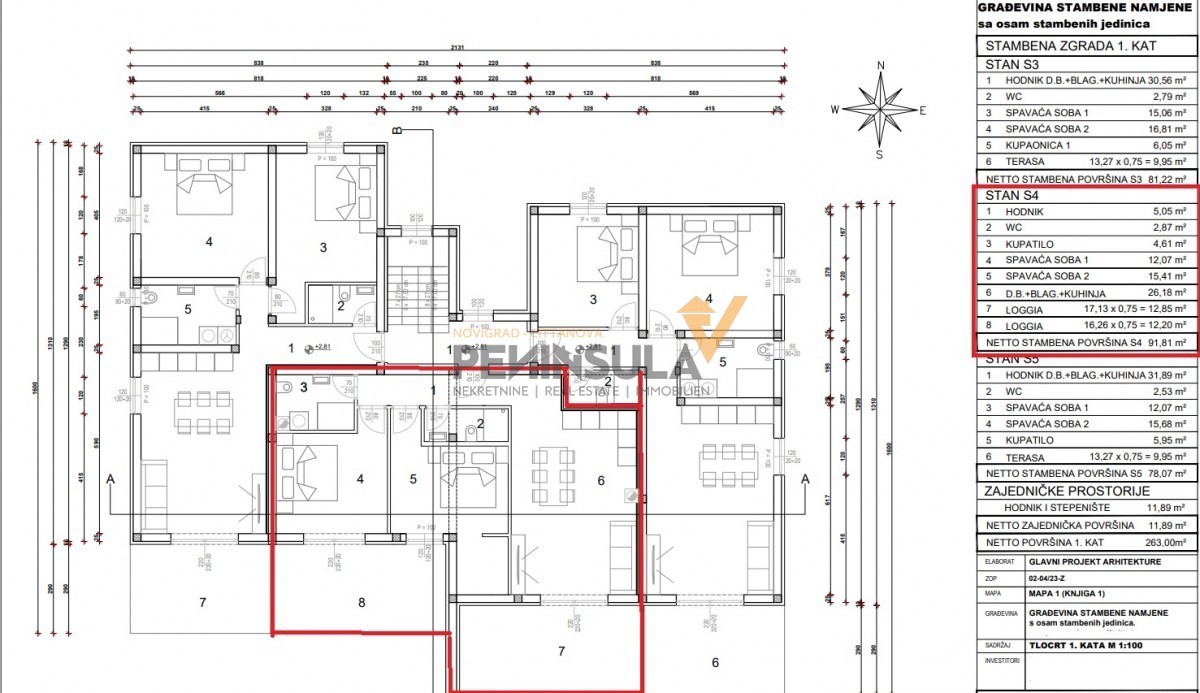 Eine neu gebaute Wohnung steht zum Verkauf in einer ruhigen Lage in Novigrad, 800 m vom Meer und einem gepflegten Strand sowie 1000 m vom Zentrum von Novigrad entfernt. Die Wohnung befindet sich im 1. Stock eines Gebäudes mit insgesamt 8 Wohnungen. Sie hat eine Fläche von 91,81 m² und besteht aus einem Flur, 2 Badezimmern, 2 Schlafzimmern mit Zugang zur Loggia und einem offenen Wohnbereich mit Küche, Essbereich und Wohnzimmer mit Zugang zu einer weiteren Loggia mit schönem Meerblick. Die Heizung und Kühlung erfolgt über Fußbodenheizung in den Bädern, Klimaanlage und einen Kaminanschluss, sodass ein Kamin oder ein Pelletofen installiert werden kann. Die Wohnung ist für Wohnzwecke bestimmt.