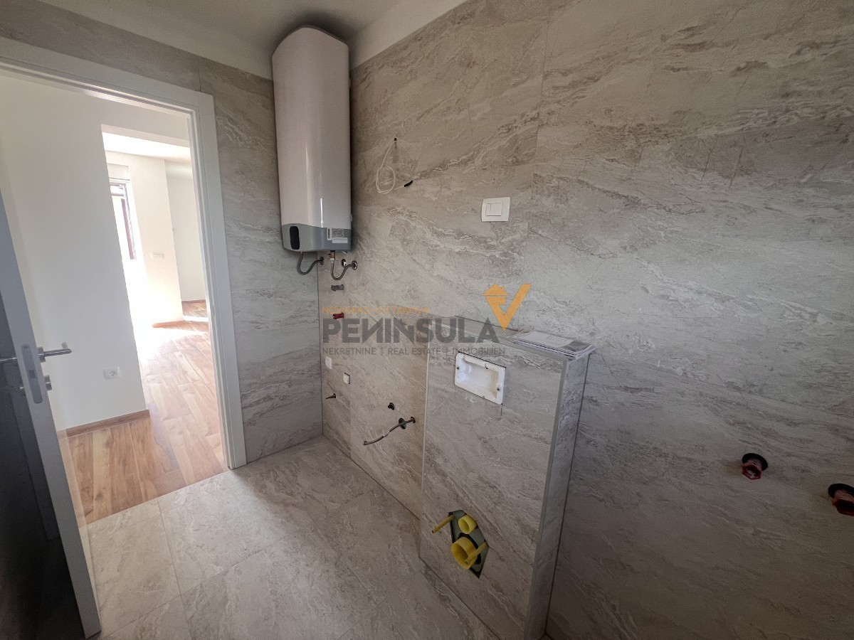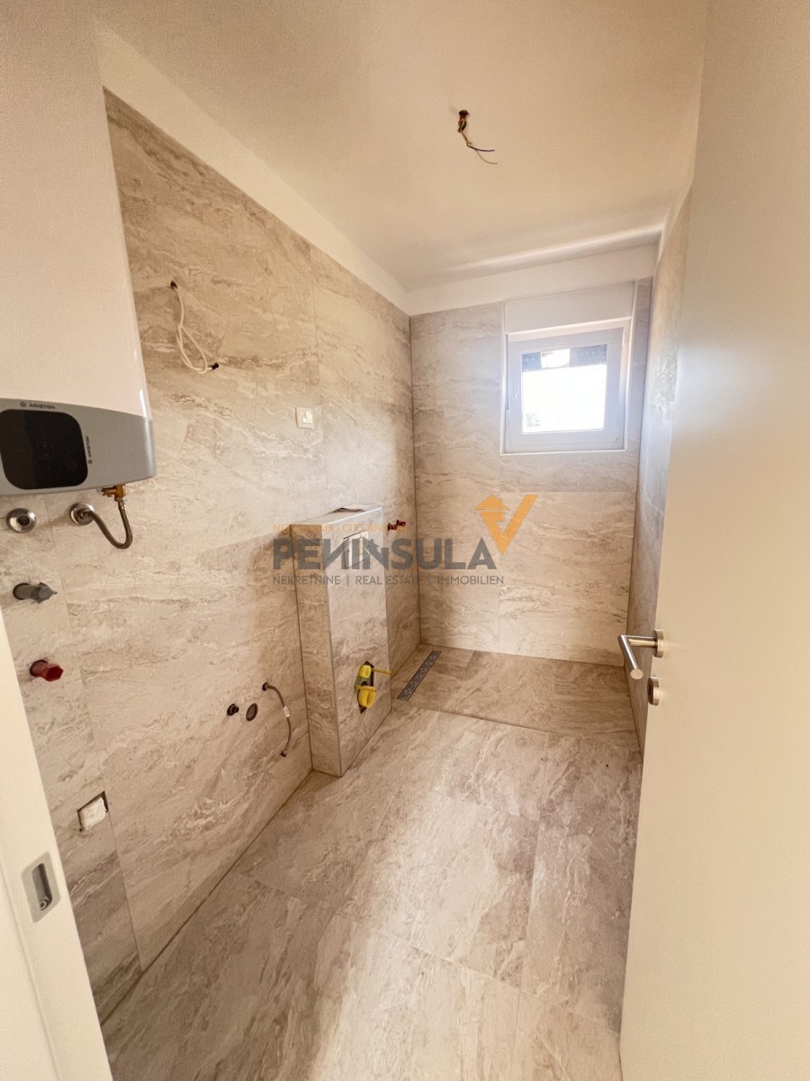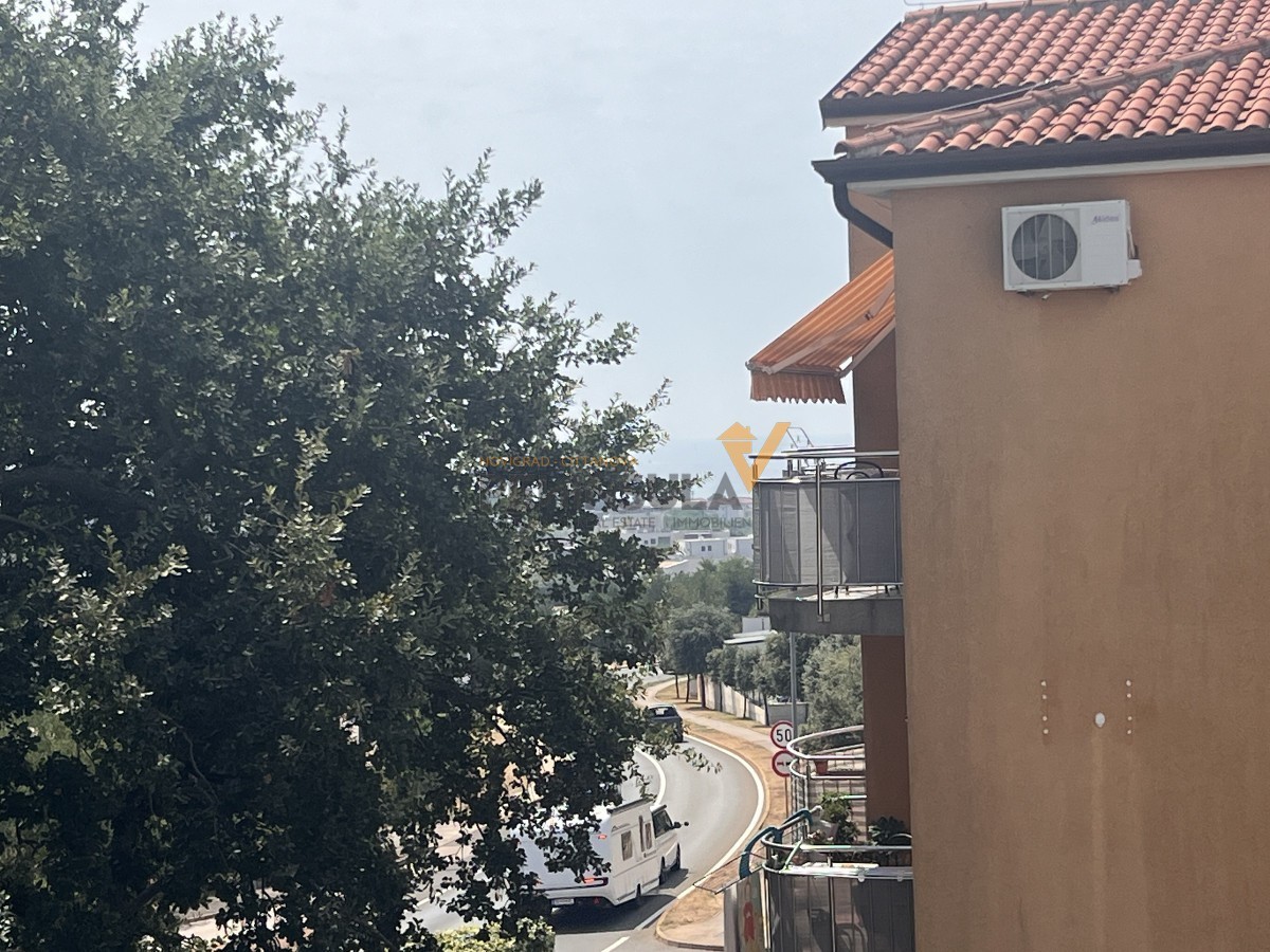 Zum Verkauf steht eine Wohnung im zweiten Stock eines Wohngebäudes mit insgesamt acht Einheiten. Die Wohnung hat eine Fläche von 67 m² und bietet einen funktionalen Grundriss, der ein Badezimmer, zwei Schlafzimmer, eine Küche mit Essbereich und ein Wohnzimmer umfasst. Eines der Schlafzimmer hat Zugang zu einer Loggia, während das Wohnzimmer ebenfalls auf eine geräumige Loggia mit herrlichem Meerblick führt.