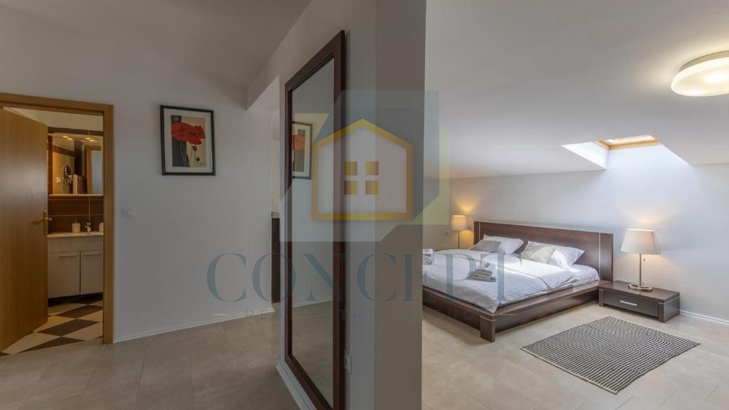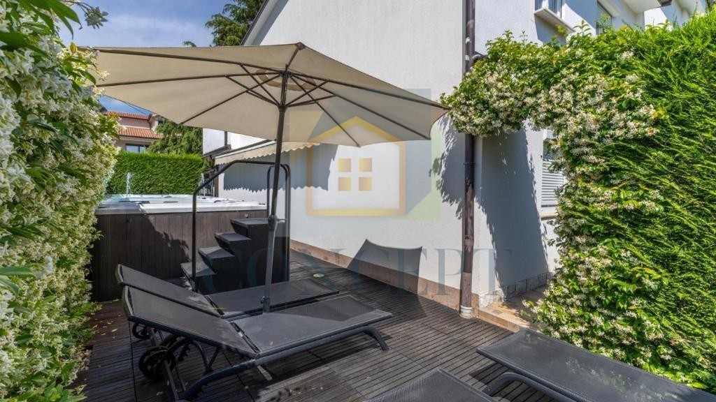 Elegantes Einfamilienhaus mit einer Fläche von 365 m², gelegen auf einem Grundstück von 530 m², in einer begehrten Wohngegend der Stadt Poreč, nur 800 m vom Meer entfernt. Das Haus erstreckt sich über drei Etagen.