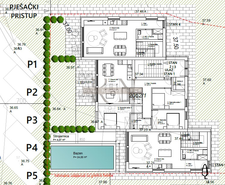 Das Projekt umfasst drei Wohnungen (75 m², 85 m² und 93,42 m²) sowie zwei Häuser, von denen eines über einen eigenen Pool verfügt.