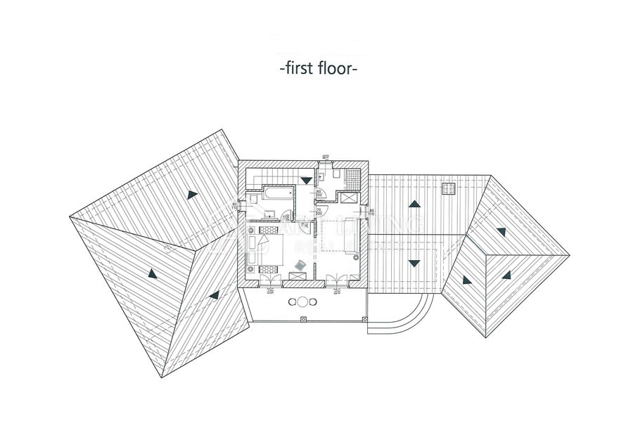 Im Obergeschoss befindet sich das Hauptschlafzimmer mit einer zusätzlichen Entspannungsecke – ideal für Ruhe und Privatsphäre. Das Zimmer öffnet sich zu einem geräumigen Balkon mit Panoramablick auf den Pool, die umliegenden Häuser und den Meereshorizont. Im ersten Stock befinden sich außerdem zwei moderne Badezimmer.