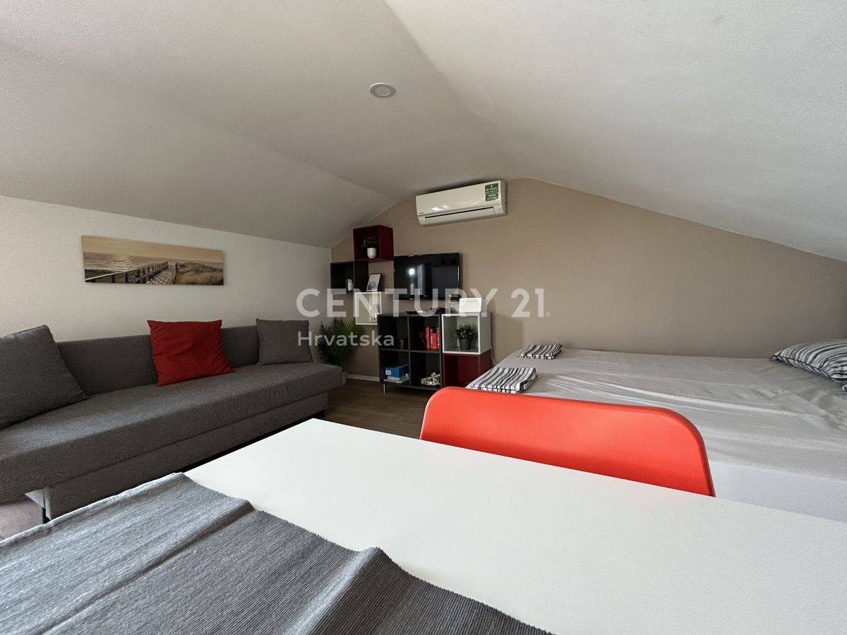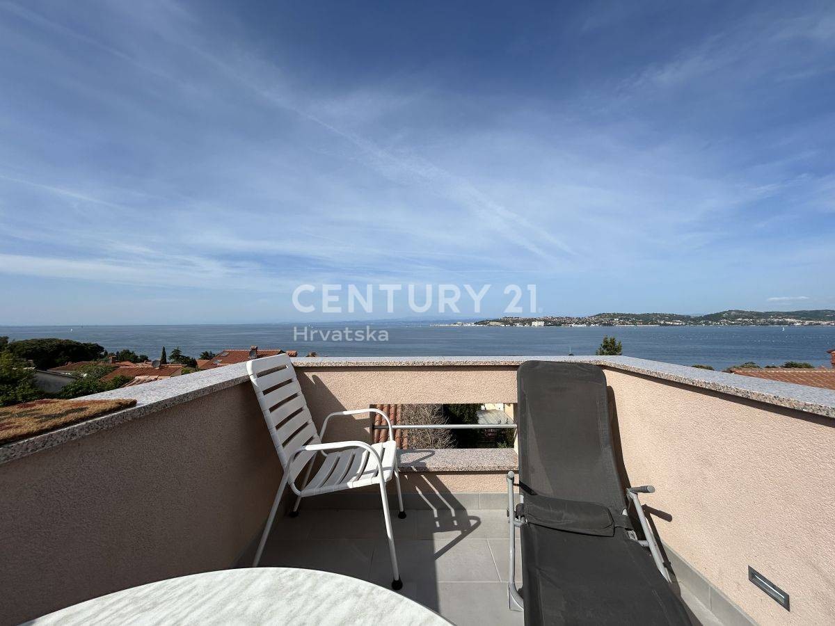 Die Dachgeschosswohnung mit 30 m2 besteht aus Eingangsflur, offener Küche mit Wohn- und Schlafbereich, Badezimmer und Terrasse mit spektakulärem Meerblick, italienischen Alpen und slowenischer Küste.