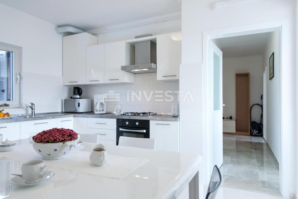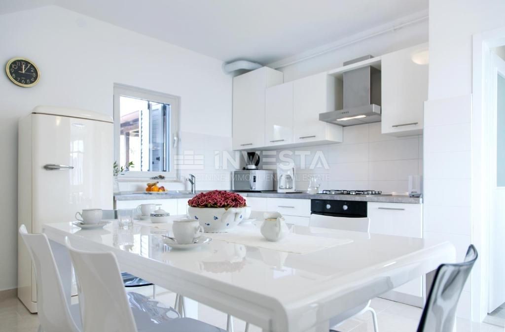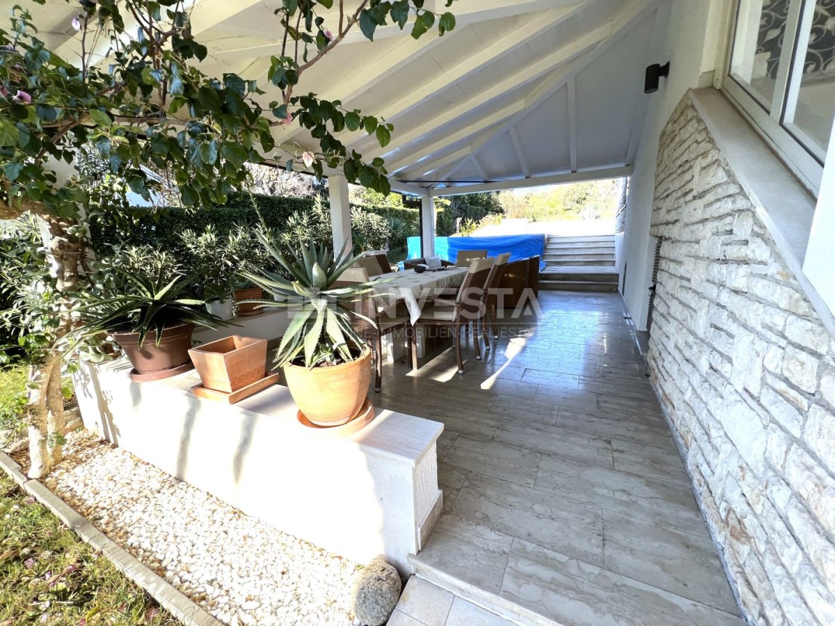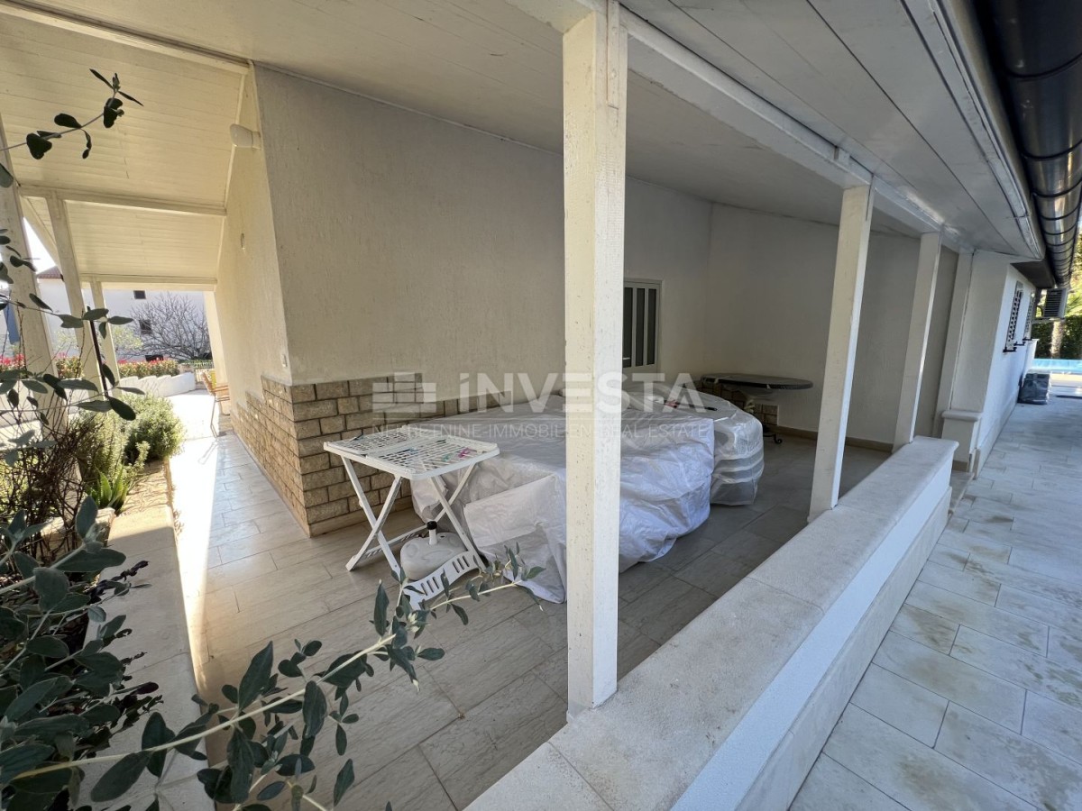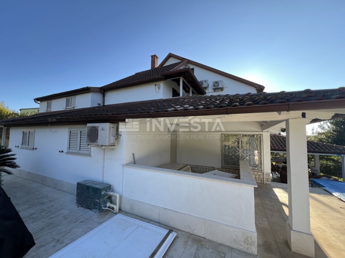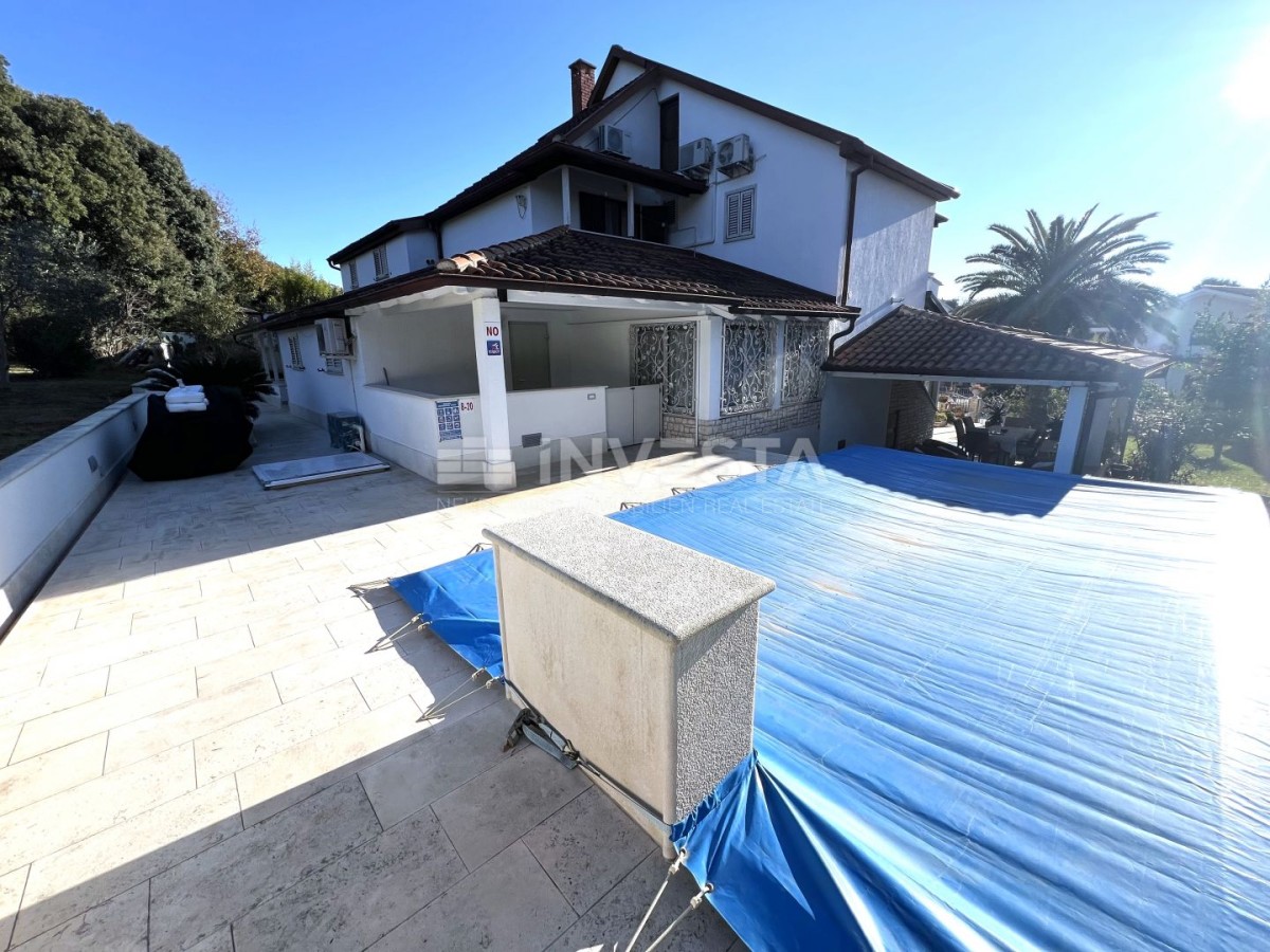 Zum Verkauf steht ein geräumiges Haus in ruhiger Lage in der Umgebung von Pula, nur 300 m vom Meer und den Stränden entfernt. Das Haus hat eine Bruttogeschossfläche von 530 m² und befindet sich auf einem Grundstück von 763 m², das von üppigem Grün umgeben ist. Im gepflegten Garten befinden sich ein beheizter Pool mit Sonnenliegefläche, überdachte Terrassen und ein Außenkamin.