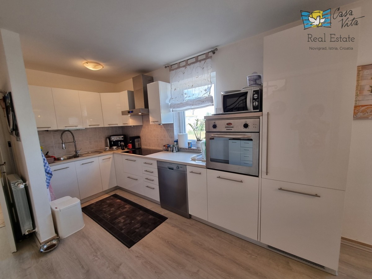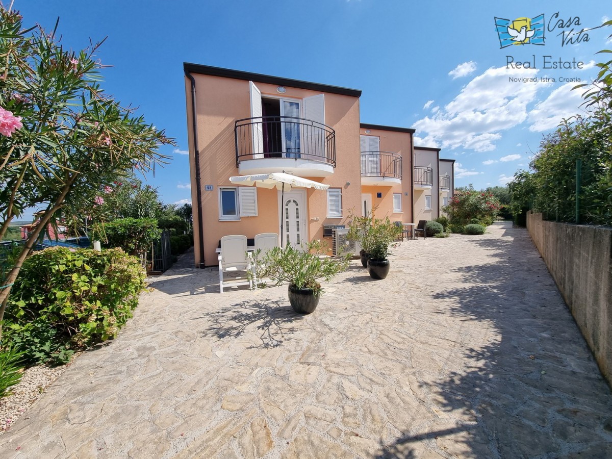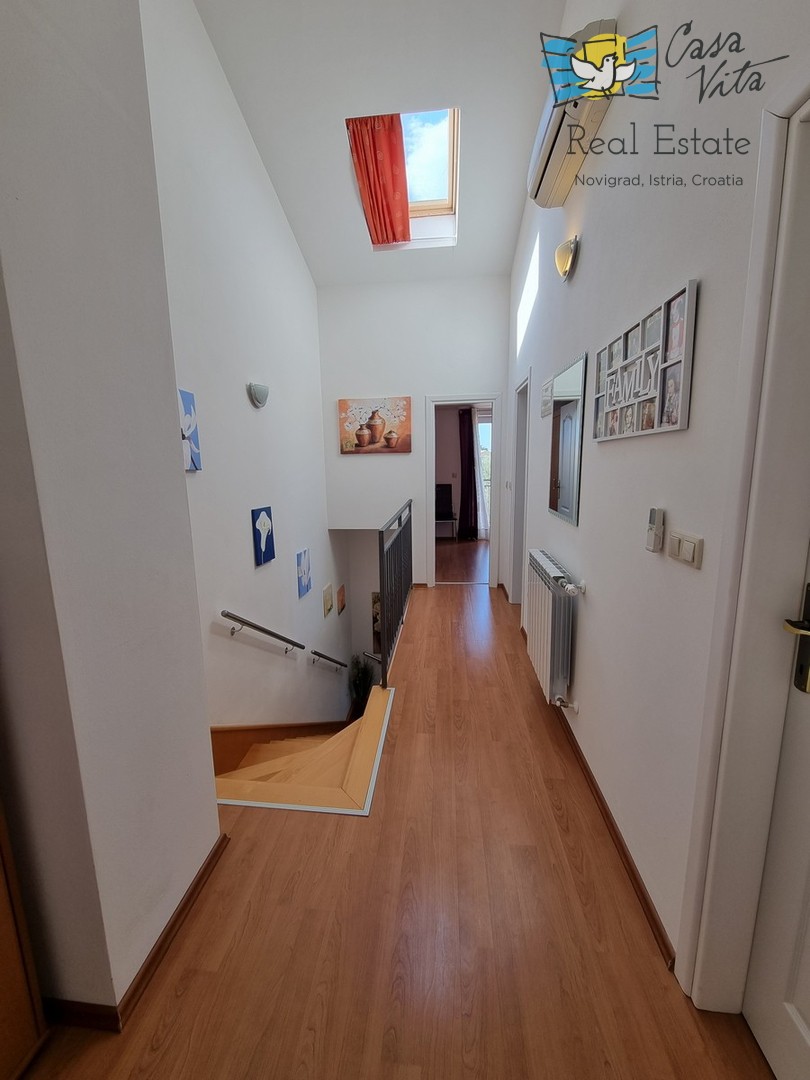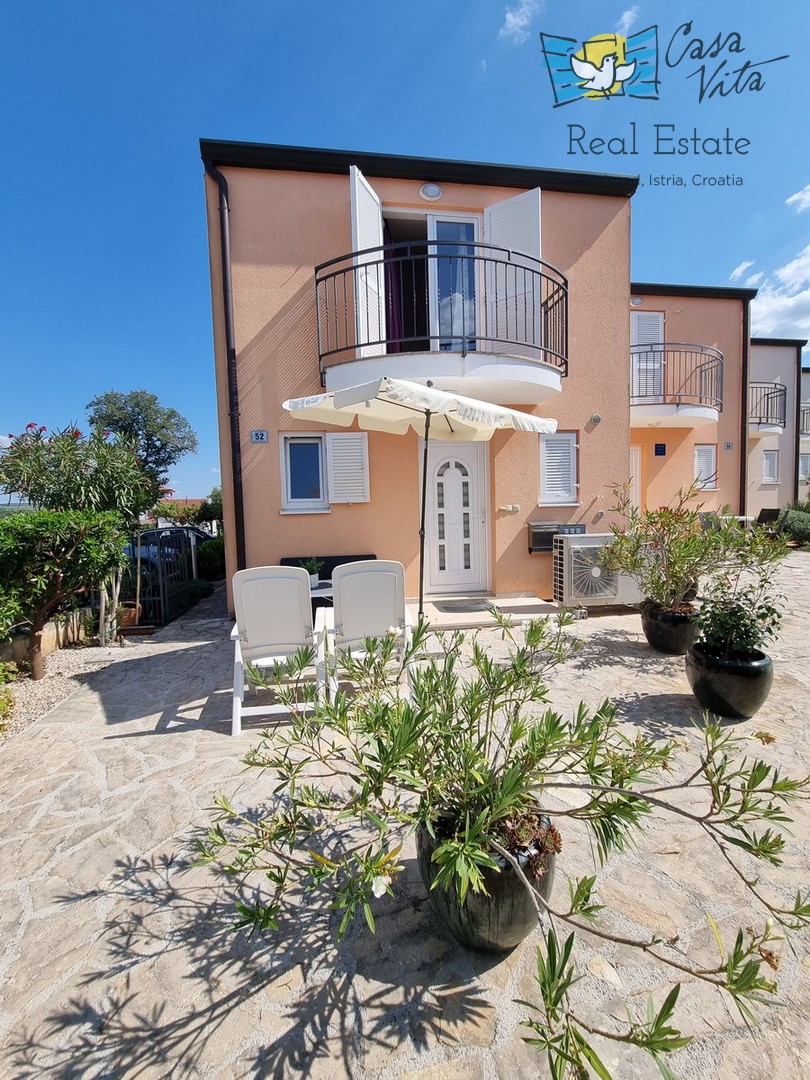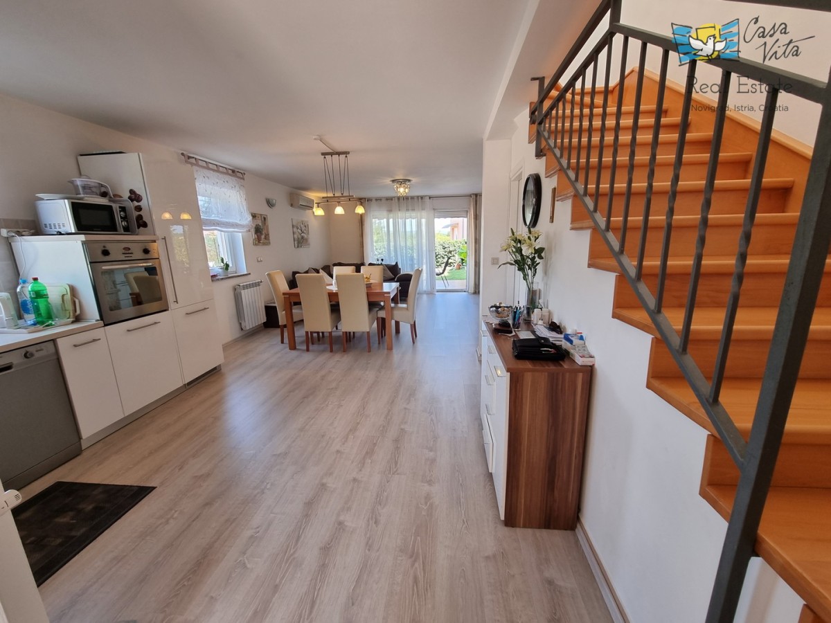 DIE WEITERE UMGEBUNG VON POREČ !!! In einer istrischen Stadt, in ruhiger Lage, mit freiem Blick in die Natur, das erste Haus in Folge von 105,75 m2 mit eigenem Garten von 290 m2. Es wurde 2008 gebaut. Es besteht aus Erdgeschoss und erster Etage. Das Erdgeschoss verfügt über einen Flur, WC + Waschküche, Technikraum, der Rest des Erdgeschosses ist ein großer Raum mit Küche, Esszimmer und Wohnzimmer mit Kamin, Abstellraum. Das Wohnzimmer öffnet sich zur Terrasse und zum Garten. Im Obergeschoss befinden sich drei Schlafzimmer, zwei davon mit eigenem Balkon und ein großes Badezimmer mit Dusche. Das Haus verfügt über eine elektrische Zentralheizung und auf jeder Etage befindet sich eine Klimaanlage. Es ist sehr gut erhalten und wird komplett mit Möbeln und Geräten verkauft. Die Wohnung verfügt auch über 2 Parkplätze.