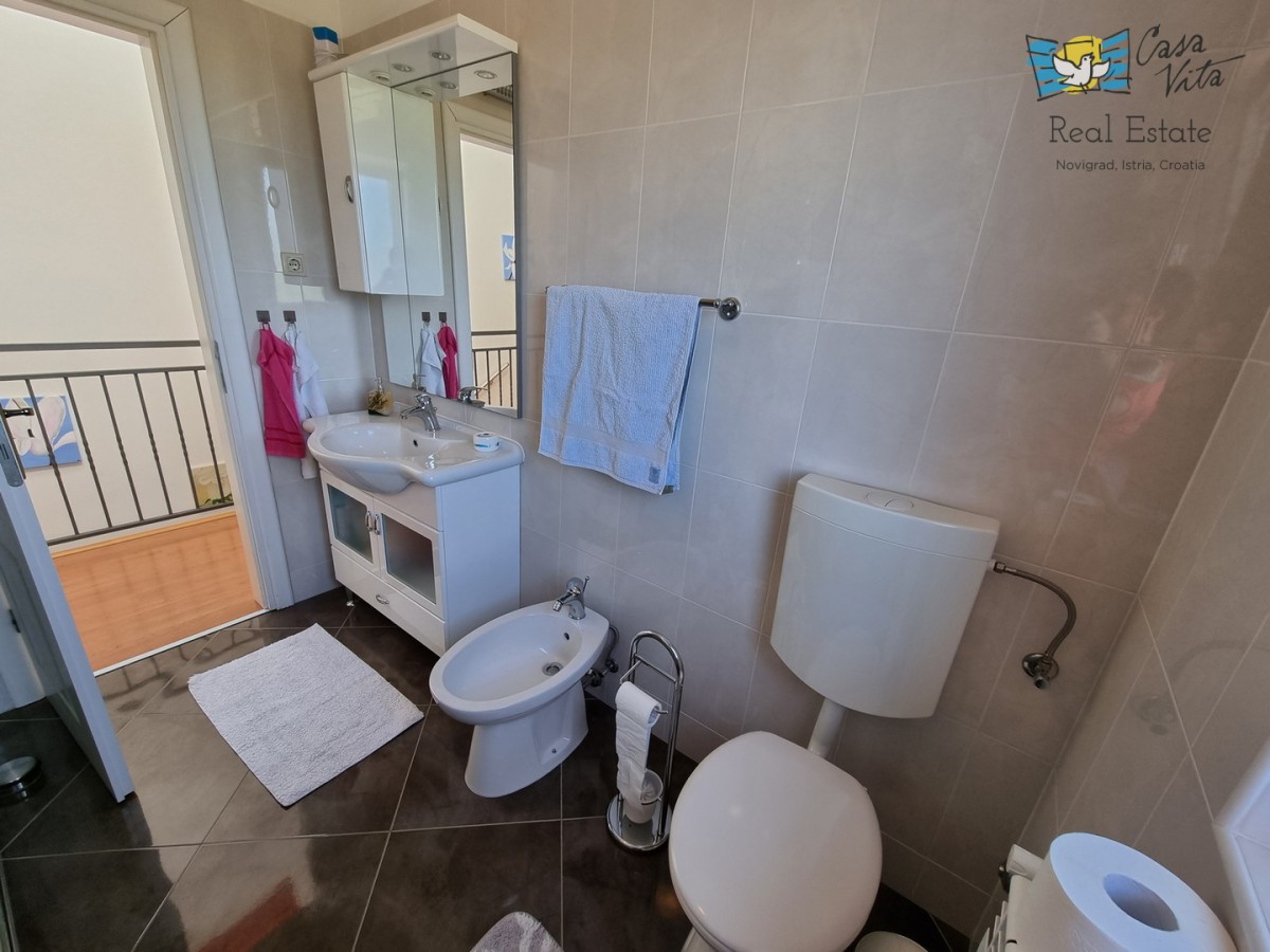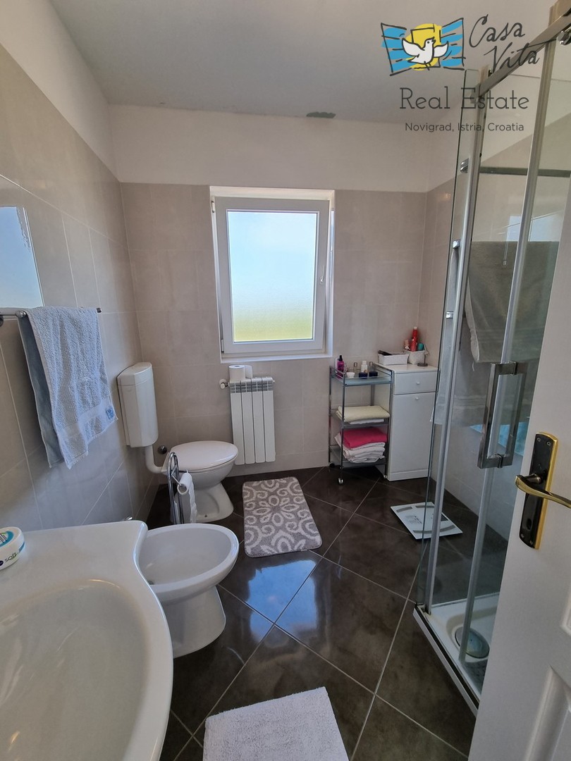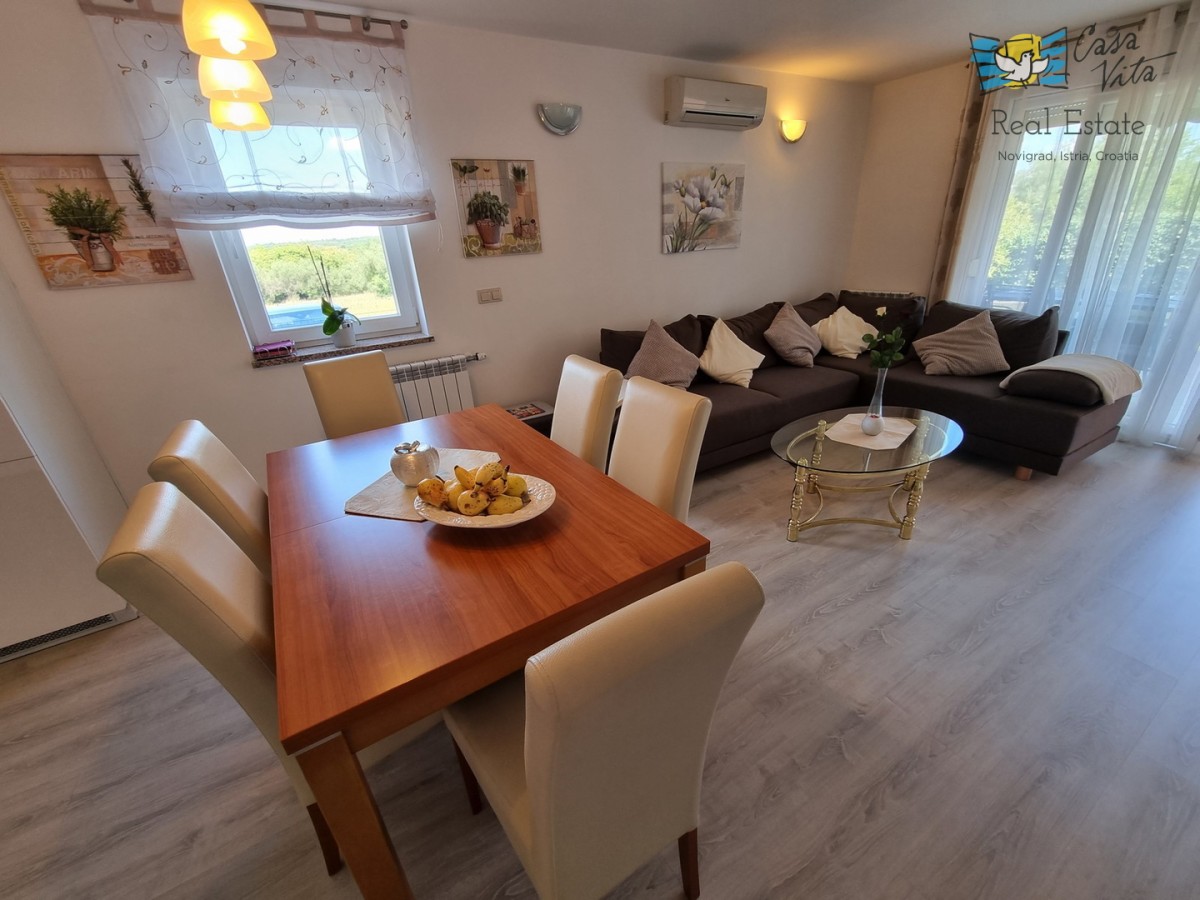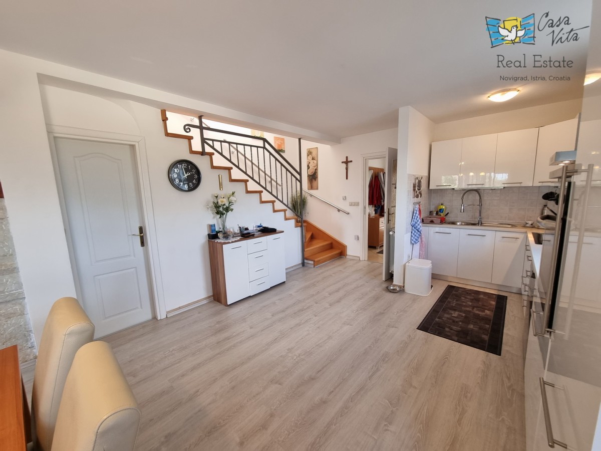 DIE WEITERE UMGEBUNG VON POREČ !!! In einer istrischen Stadt, in ruhiger Lage, mit freiem Blick in die Natur, das erste Haus in Folge von 105,75 m2 mit eigenem Garten von 290 m2. Es wurde 2008 gebaut. Es besteht aus Erdgeschoss und erster Etage. Das Erdgeschoss verfügt über einen Flur, WC + Waschküche, Technikraum, der Rest des Erdgeschosses ist ein großer Raum mit Küche, Esszimmer und Wohnzimmer mit Kamin, Abstellraum. Das Wohnzimmer öffnet sich zur Terrasse und zum Garten. Im Obergeschoss befinden sich drei Schlafzimmer, zwei davon mit eigenem Balkon und ein großes Badezimmer mit Dusche. Das Haus verfügt über eine elektrische Zentralheizung und auf jeder Etage befindet sich eine Klimaanlage. Es ist sehr gut erhalten und wird komplett mit Möbeln und Geräten verkauft. Die Wohnung verfügt auch über 2 Parkplätze.