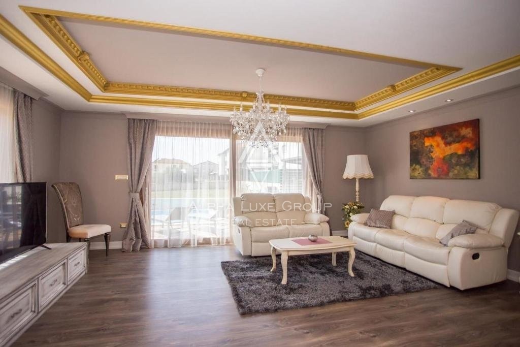 Vom Wohnzimmer aus gibt es eine Terrasse, die zu einem wunderschön angelegten Garten führt, in dem sich ein Swimmingpool mit Schwimmbecken befindet.