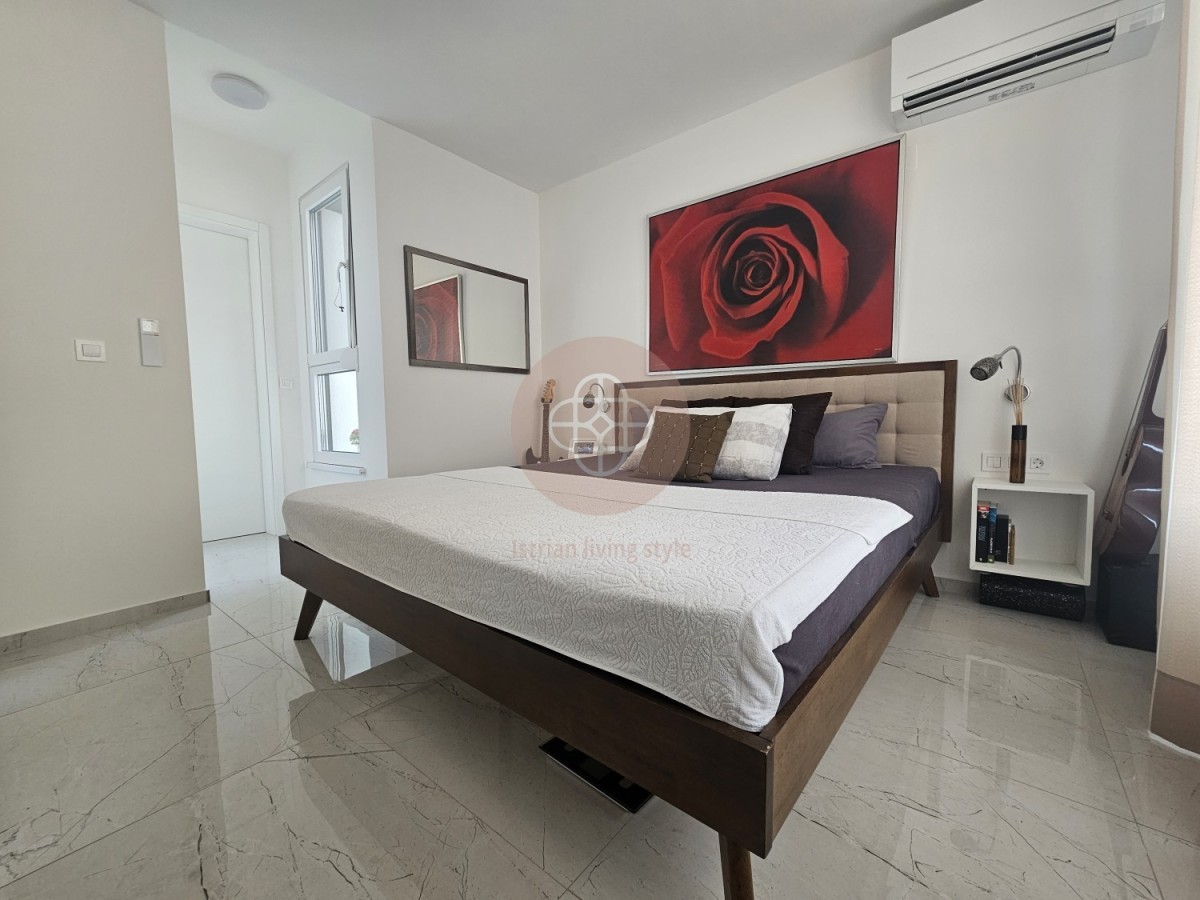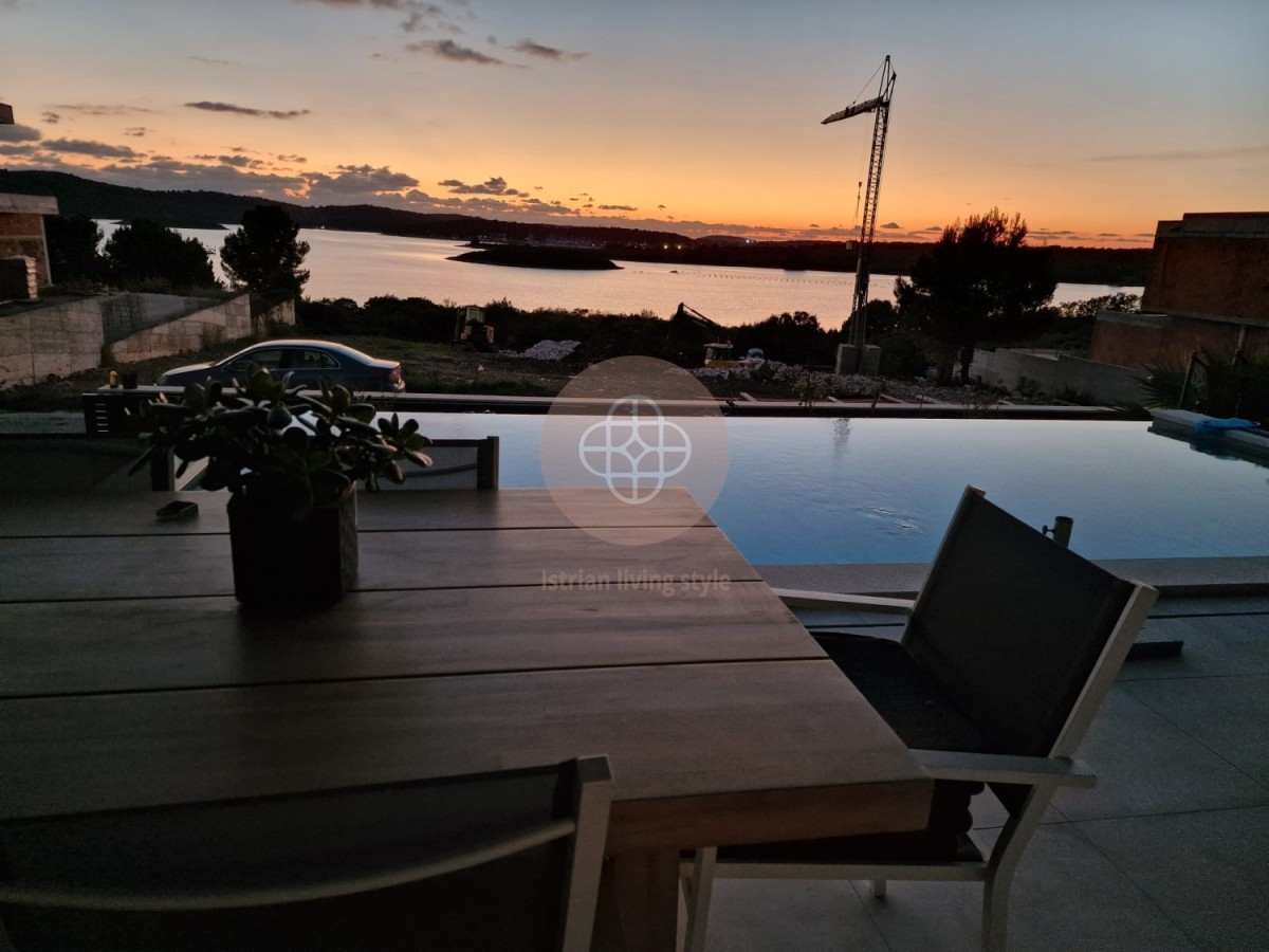 Eine der Highlights dieser Villa ist der Infinity-Pool, der einen direkten Blick auf die Meduliner Bucht und traumhafte Sonnenuntergänge bietet. Die nahtlose Verbindung zwischen Poolbereich und Innenräumen wird durch eine elegante Außenterrasse geschaffen, die Raum für Erholung und Sonnenbaden bietet und am Abend eine zauberhafte Atmosphäre mit stimmungsvollem Licht erzeugt.