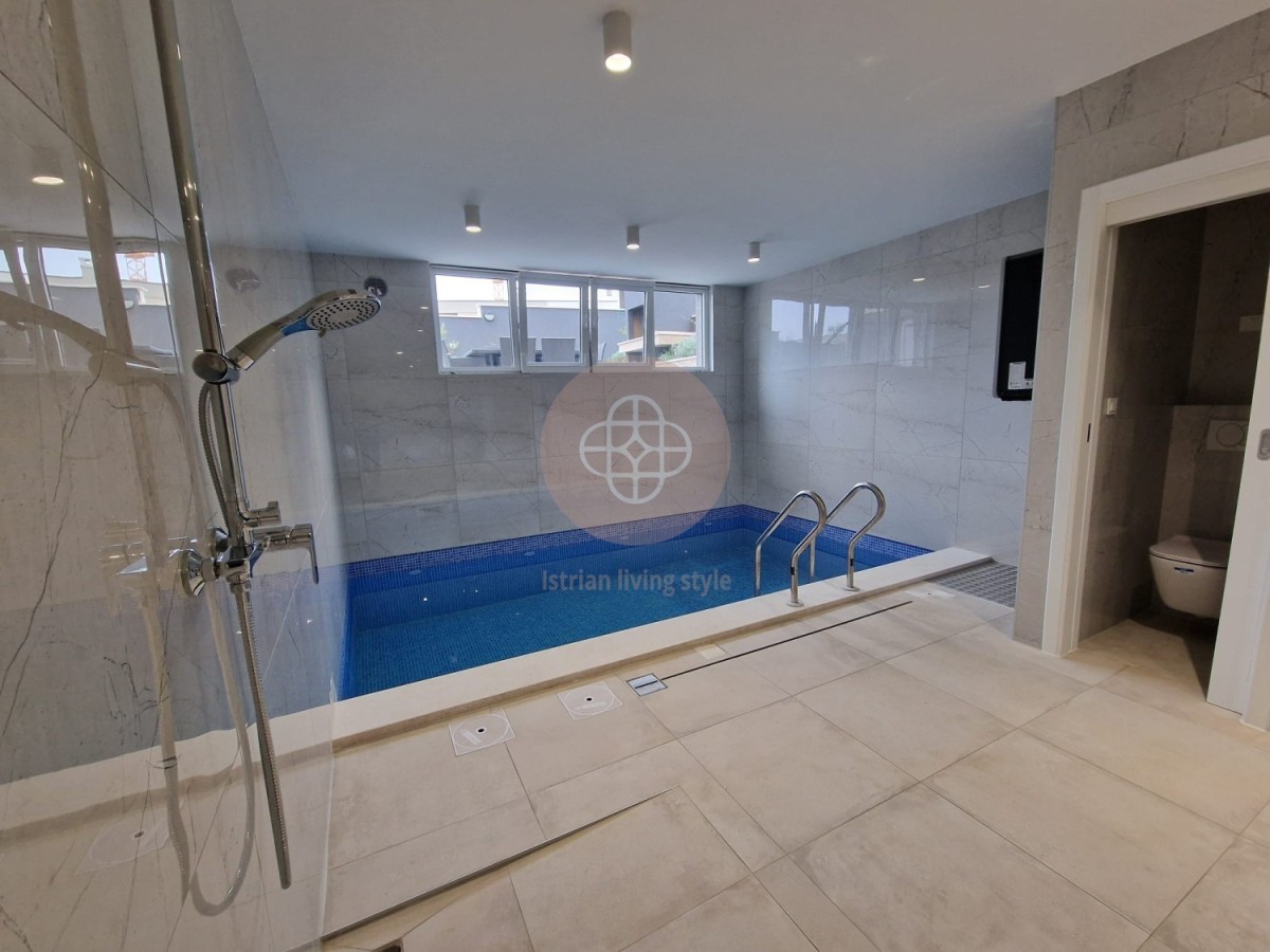 Für zusätzlichen Luxus sorgt das Spa-Center der Villa, das mit Fußbodenheizung, einer Trockensauna, einem Ruhebereich und einem beheizten Innenpool ausgestattet ist – der perfekte Ort für Entspannung und Regeneration, besonders nach einem langen Tag oder in den kühleren Monaten.